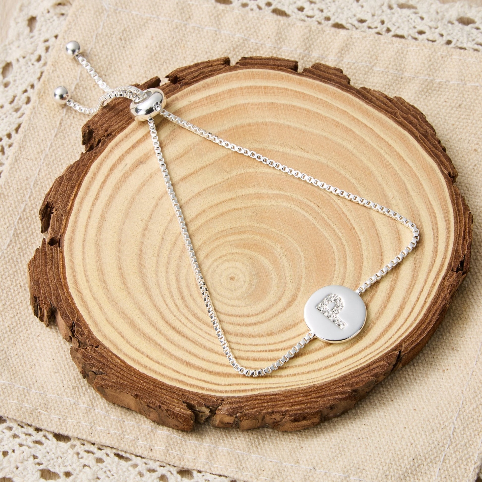 Celebrate any special occasion or moment with this adjustable Initial Friendship Bracelet from Philip Jones. Crafted with silver plated brass alloy, it features a 14.8mm round charm with a letter P on it and sparkling Zircondia® crystals in round and sizes of 1mm and 1.5mm. This beautiful bracelet is a perfect gift for your special someone.
