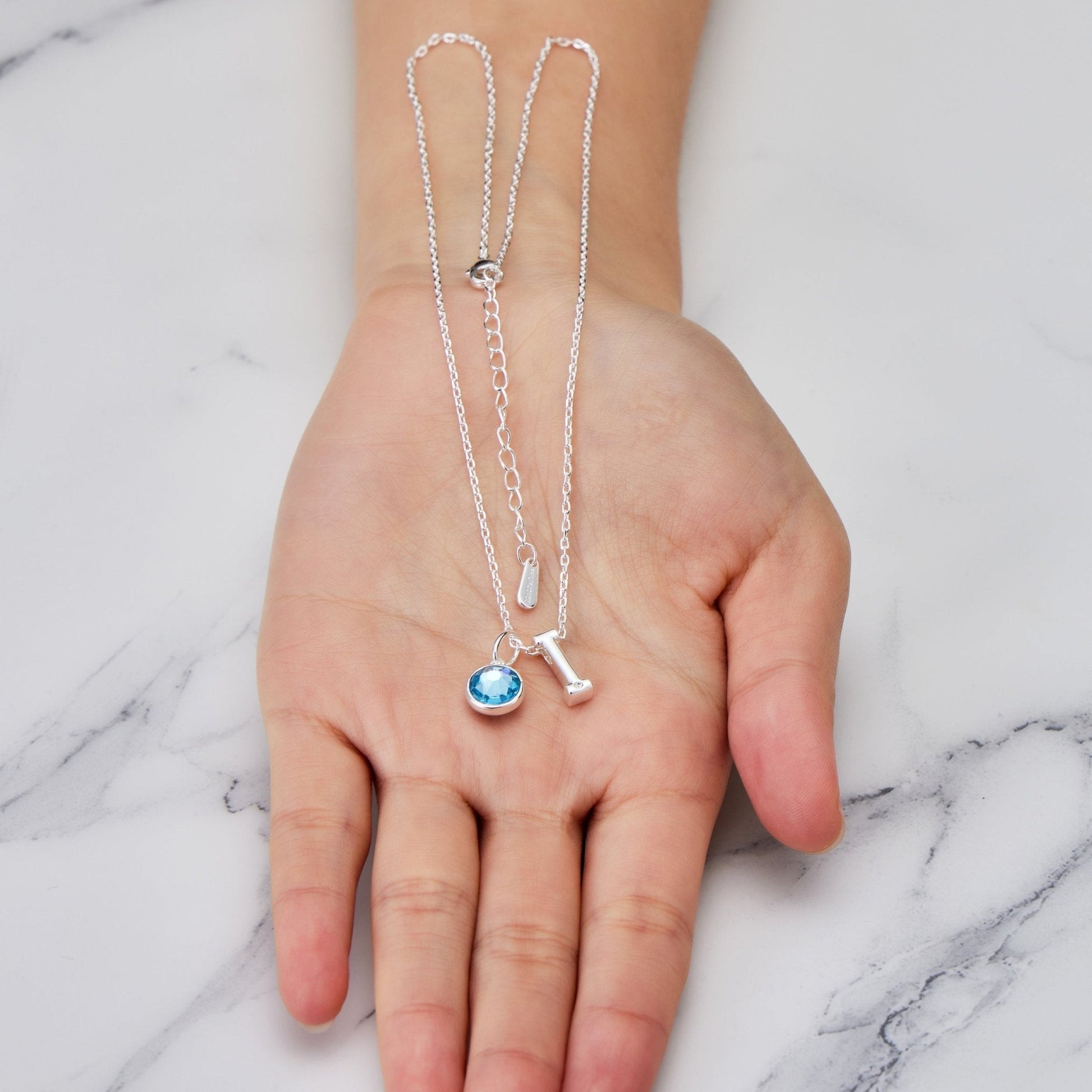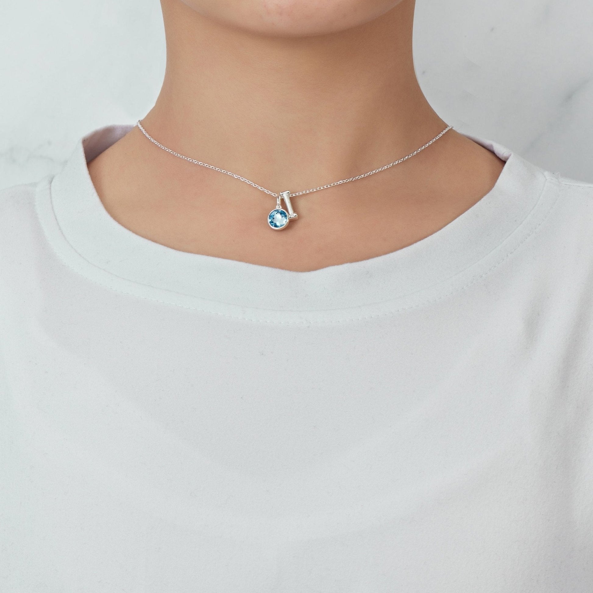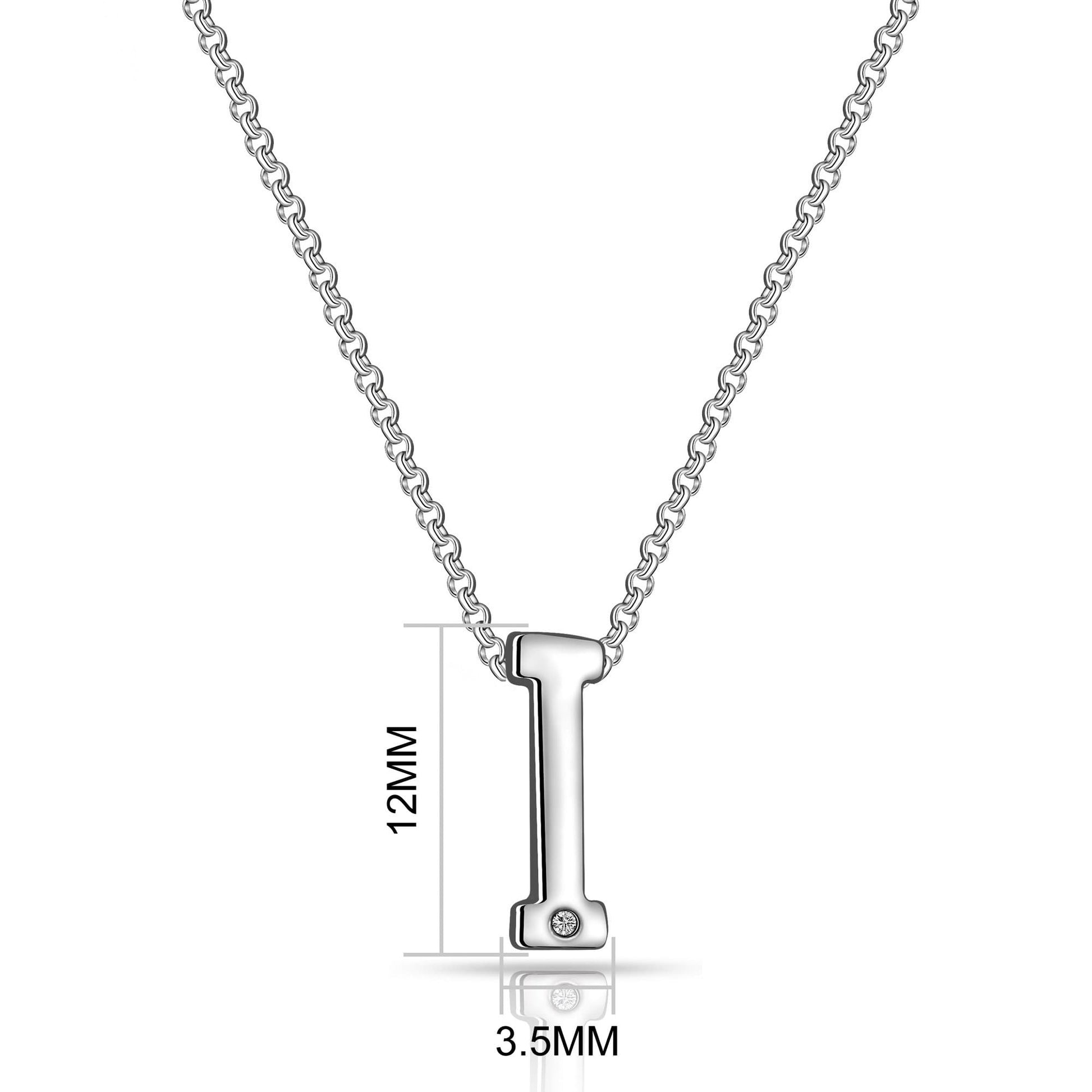 Our Birthstone Initial Necklace is crafted from silver-plated brass alloy and lobster claw closure. The pendant features a round-cut Zircondia® crystal of 1mm and a clear letter 'I' of 8mmx8mm, and hangs elegantly on a 43cm cable chain with a 5cm extender. This delicate piece is created with utmost attention to detail and only weighs 3.4g.