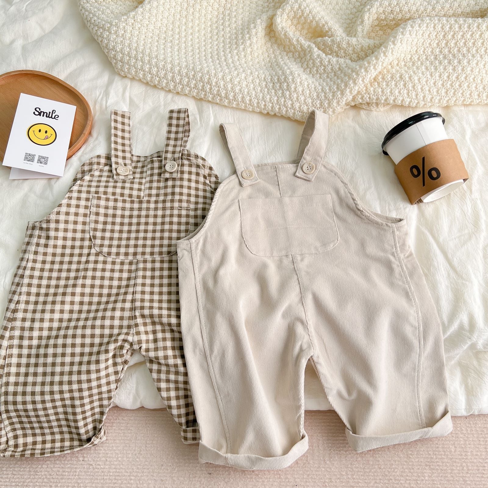 Color: creamy-white corduroy large pockets suspender pants, brown plaid corduroy large pockets suspender pants