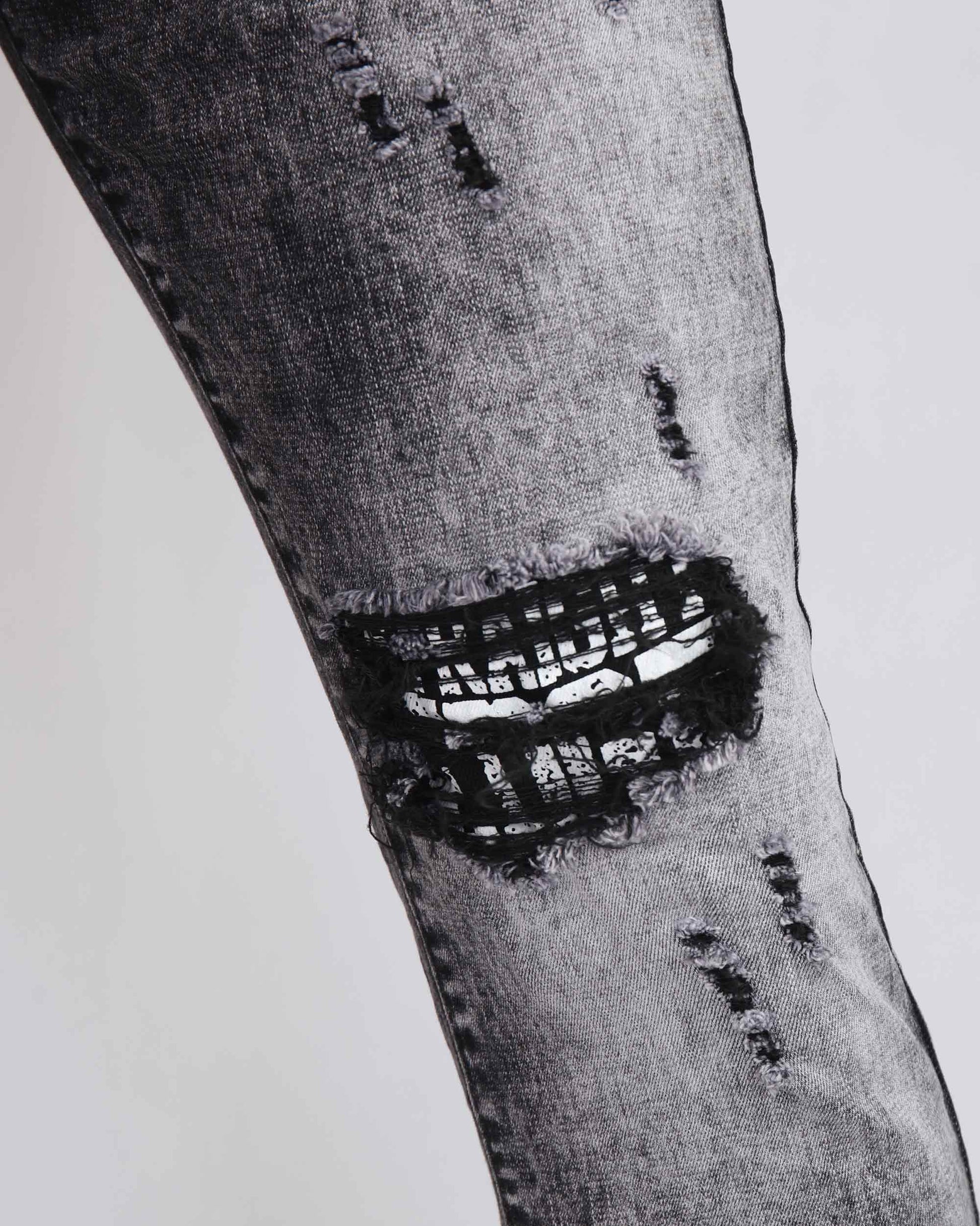 Unleash your inner rebel with our Black Jeans, featuring bold large ripped details, striking black patches, and irregular wash. These jeans striking black patches and irregular wash black denim create a captivating contrast against the and boast an individualistic character that sets them apart from the rest, making these jeans a standout piece in your wardrobe.