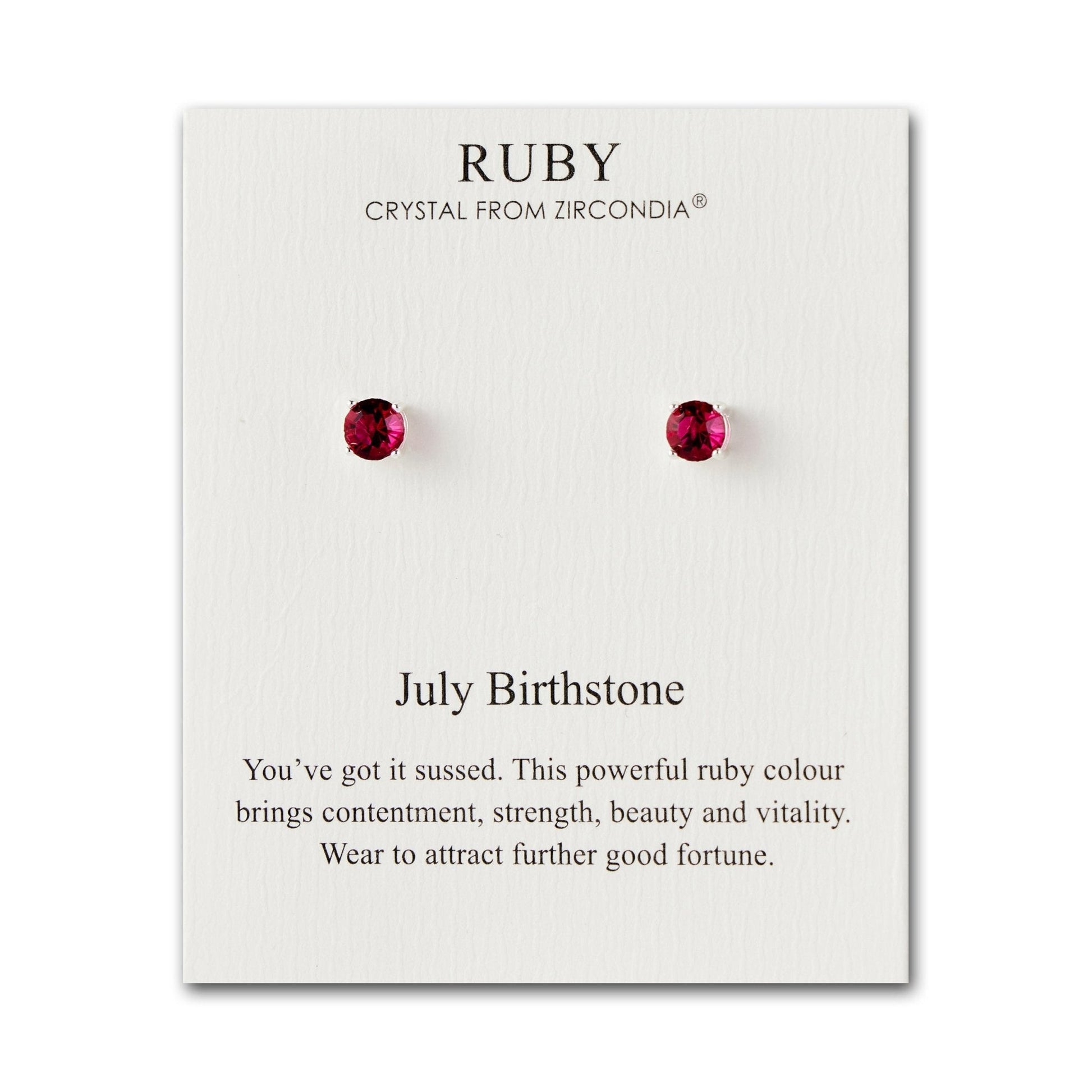 Light up your look with July (Ruby) Birthstone Earrings Created with Zircondia® Crystals. Crafted with hypoallergenic silver plated brass alloy for optimal comfort, these dazzlers feature 6mm round crystals from Zircondia®, held securely in a 4 prong setting. From coffee dates to night outs, with these earrings you're sure to sparkle! Gift pouch and quote card included.