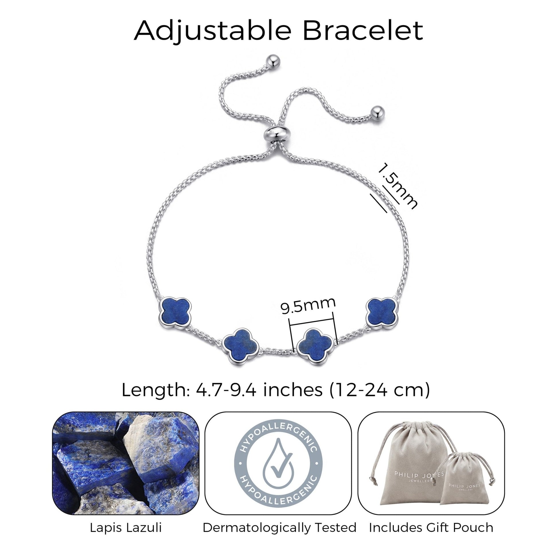 Experience the brilliance of genuine gemstones with our Lapis Multi Clover Friendship Bracelet. The stunning blue clover charms, made of silver plated brass alloy, measure 9.5mm for a perfect touch of elegance. Adjustable from 12cm to 24cm, this hypoallergenic bracelet is suitable for all. Don't miss out on this unique gift packaged in a beautiful pouch!