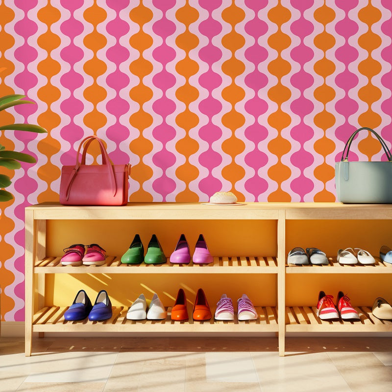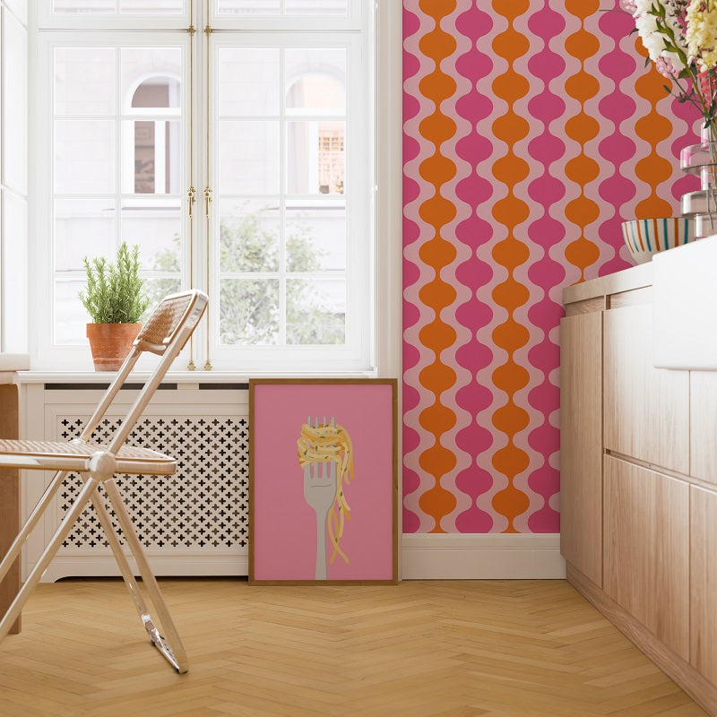 Bring a touch of retro charm into your home with our “Lava Lamp” wallpaper – a playful take on mid-century style. Featuring bold wiggle stripes that flow like liquid light, this design is the perfect mix of vintage and modern. This pink and orange colourful adds a lively and invigorating statement to any room or feature wall.