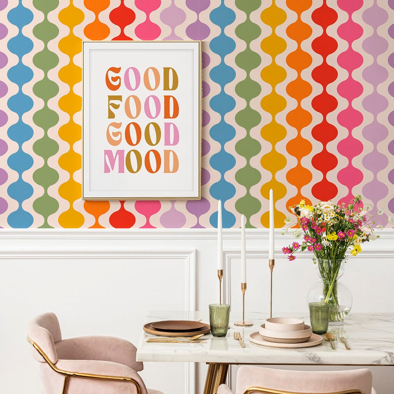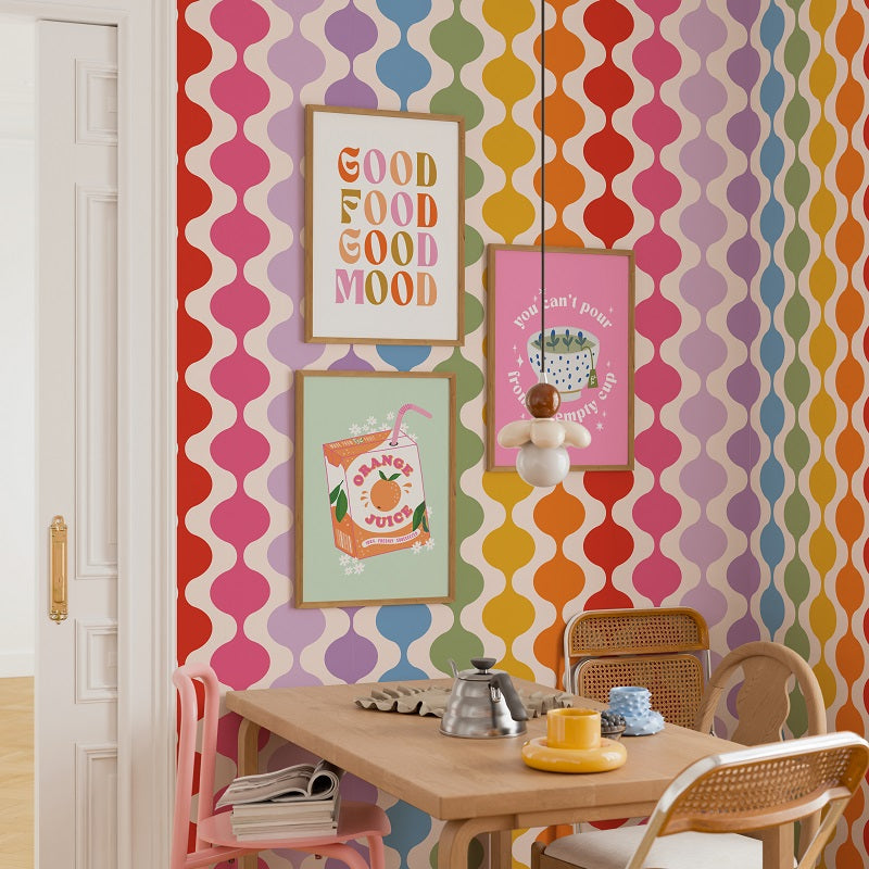 Bring a touch of retro charm into your home with our “Lava Lamp” wallpaper – a playful take on mid-century style. Featuring bold wiggle stripes that flow like liquid light, this design is the perfect mix of vintage and modern. This rainbow colourway adds a bold colourful invigorating statement to boost creativity and imagination making it ideal for playrooms, games rooms, craft rooms or feature walls.
