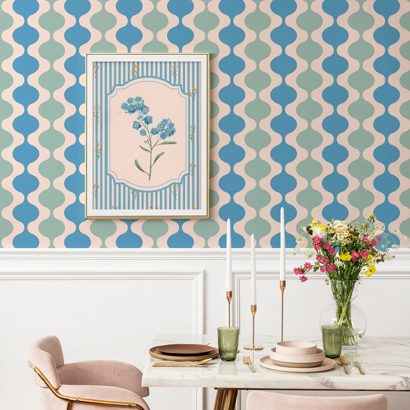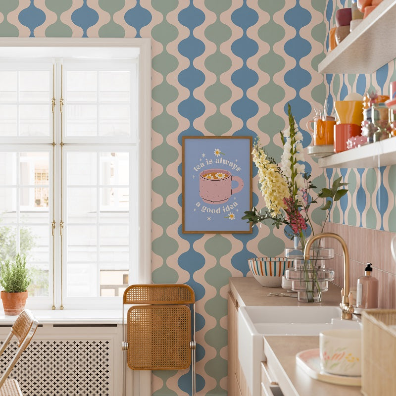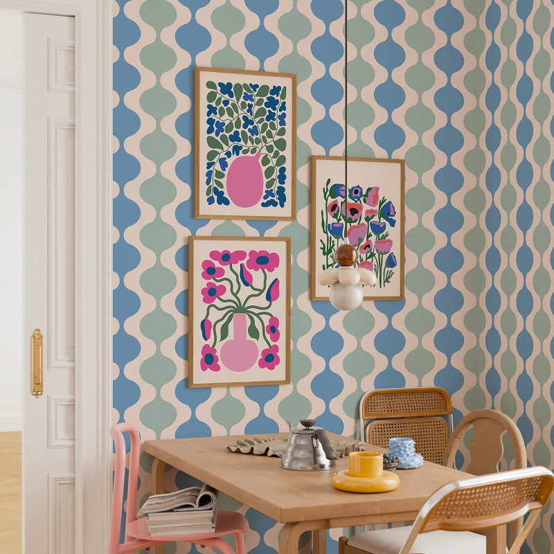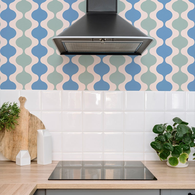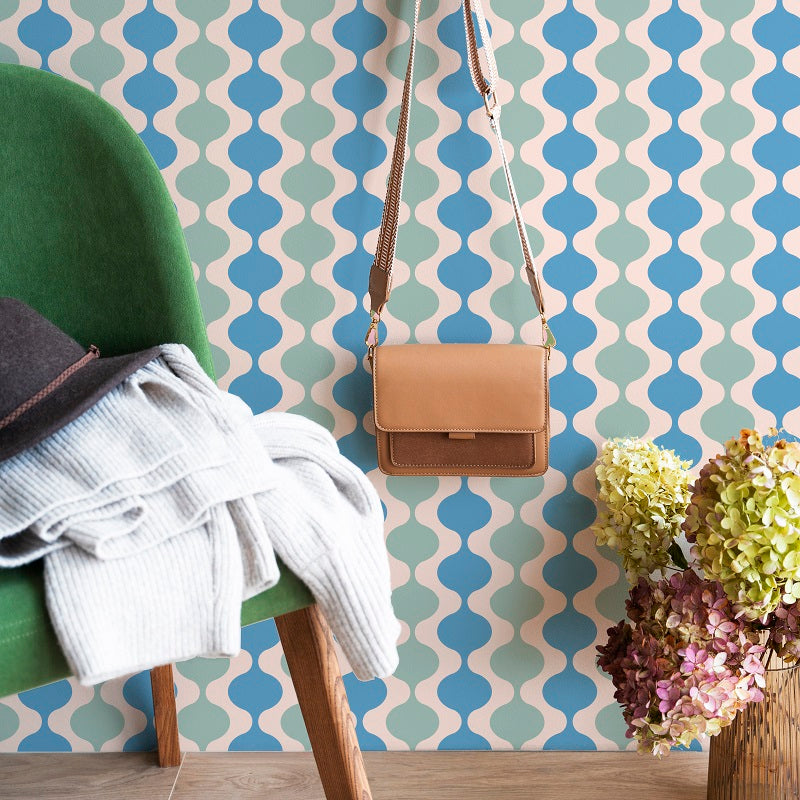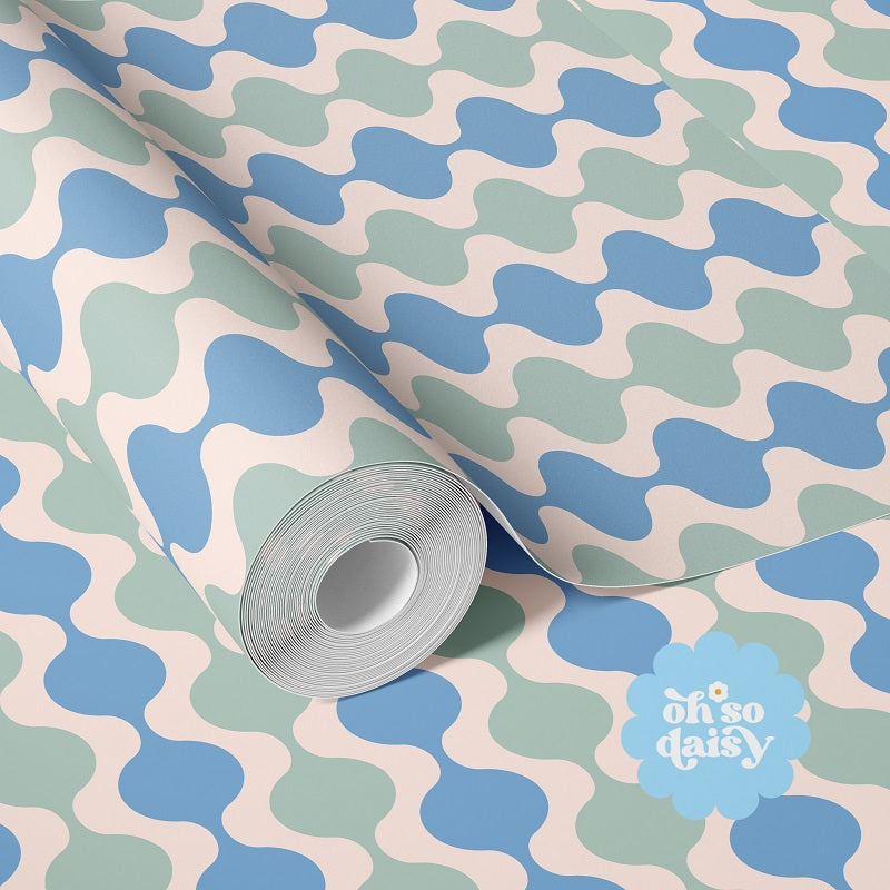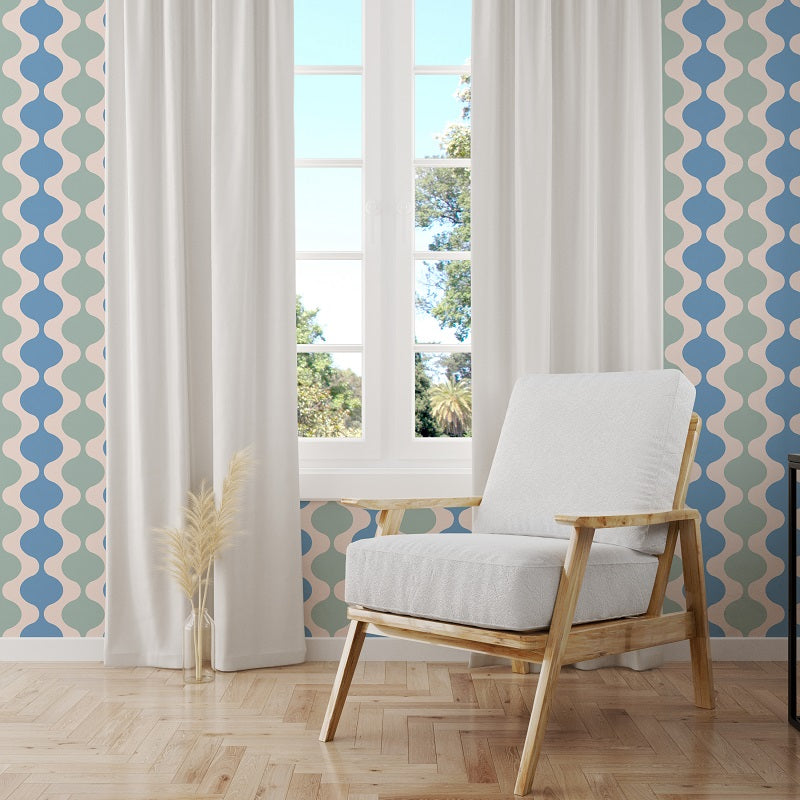 Bring a touch of retro charm into your home with our “Lava Lamp” wallpaper – a playful take on mid-century style. Featuring bold wiggle stripes that flow like liquid light, this design is the perfect mix of vintage and modern. The blue and light sage green colourway adds calmness and serenity, making it ideal for bedrooms, bathrooms, kitchens, living rooms, or feature walls.