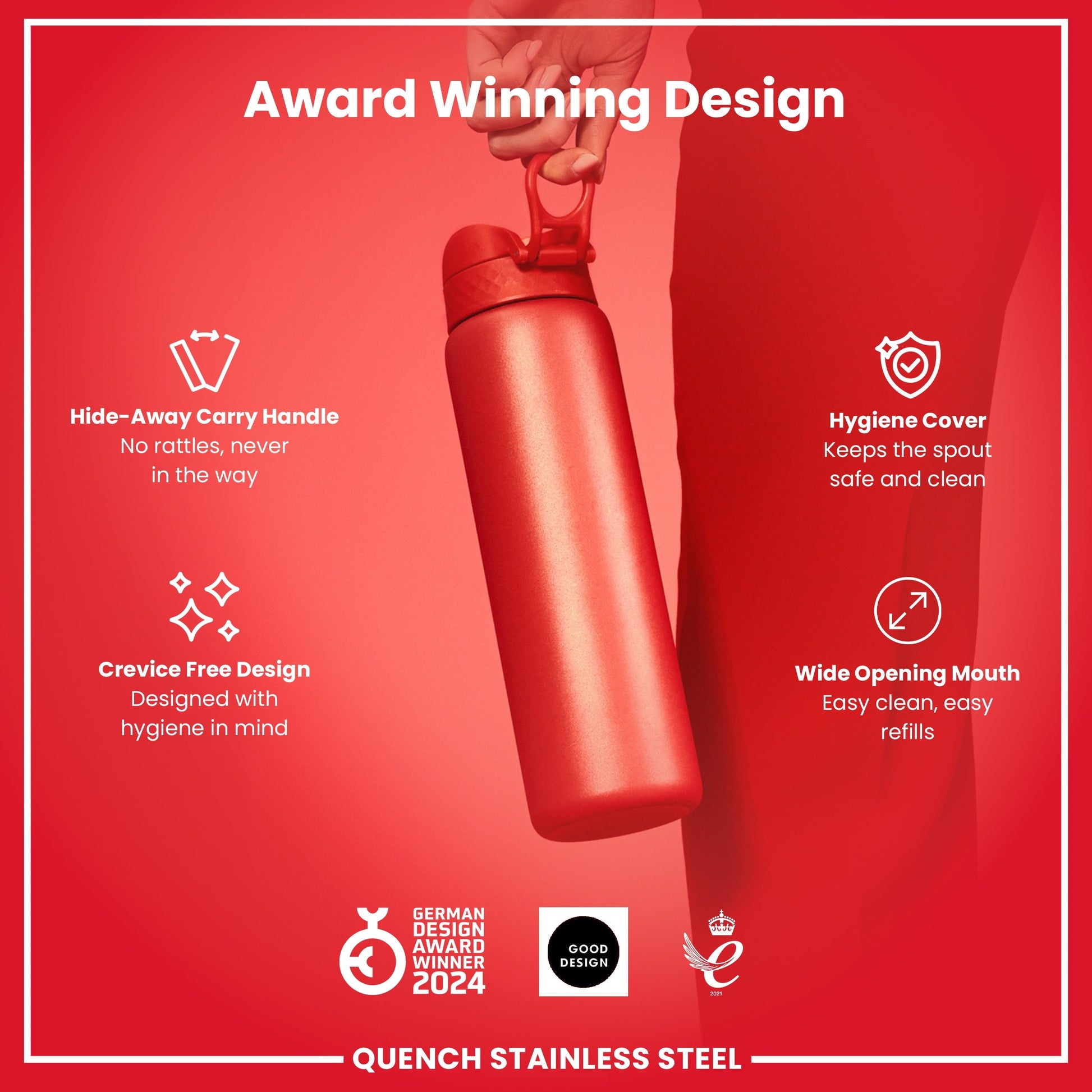 Made from stainless steel. Stainless steel is extremely durable, lasts for years, and is fully recyclable. This refillable and reusable drinks bottle is food safe, odour resistant, easy to hand wash, and keeps drinks fresh and full of flavour.