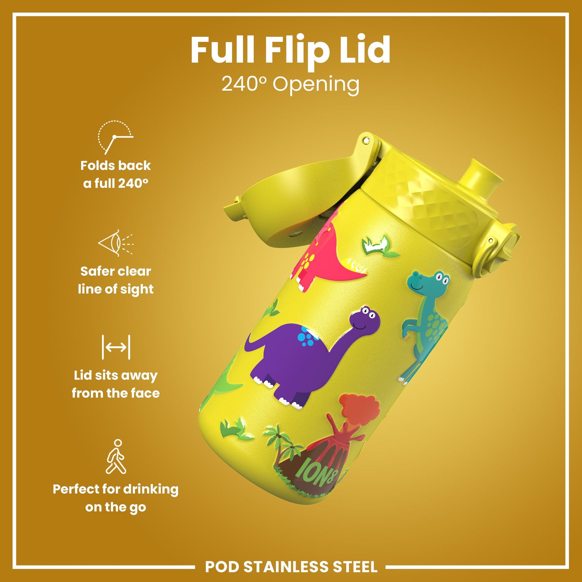 100% leak proof 400ml / 13oz stainless steel yellow water bottle with a smooth flow for spill-free hydration and hygienic full-flip top cover for one handed use on-the-go.