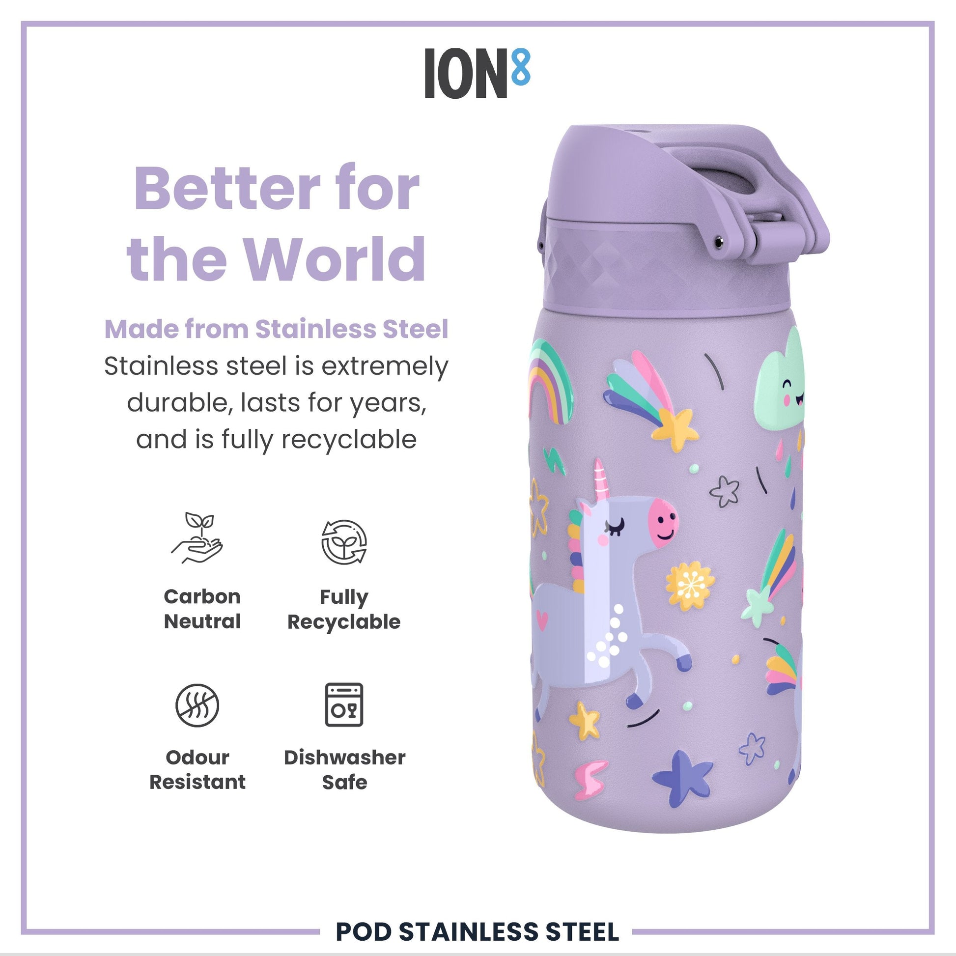 Leak Proof Kids Water Bottle, Stainless Steel, Purple Unicorns, 400ml (13oz)