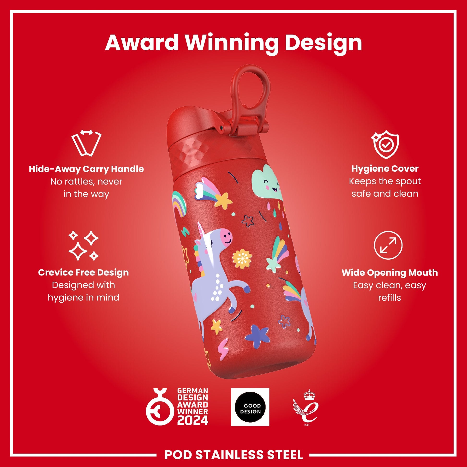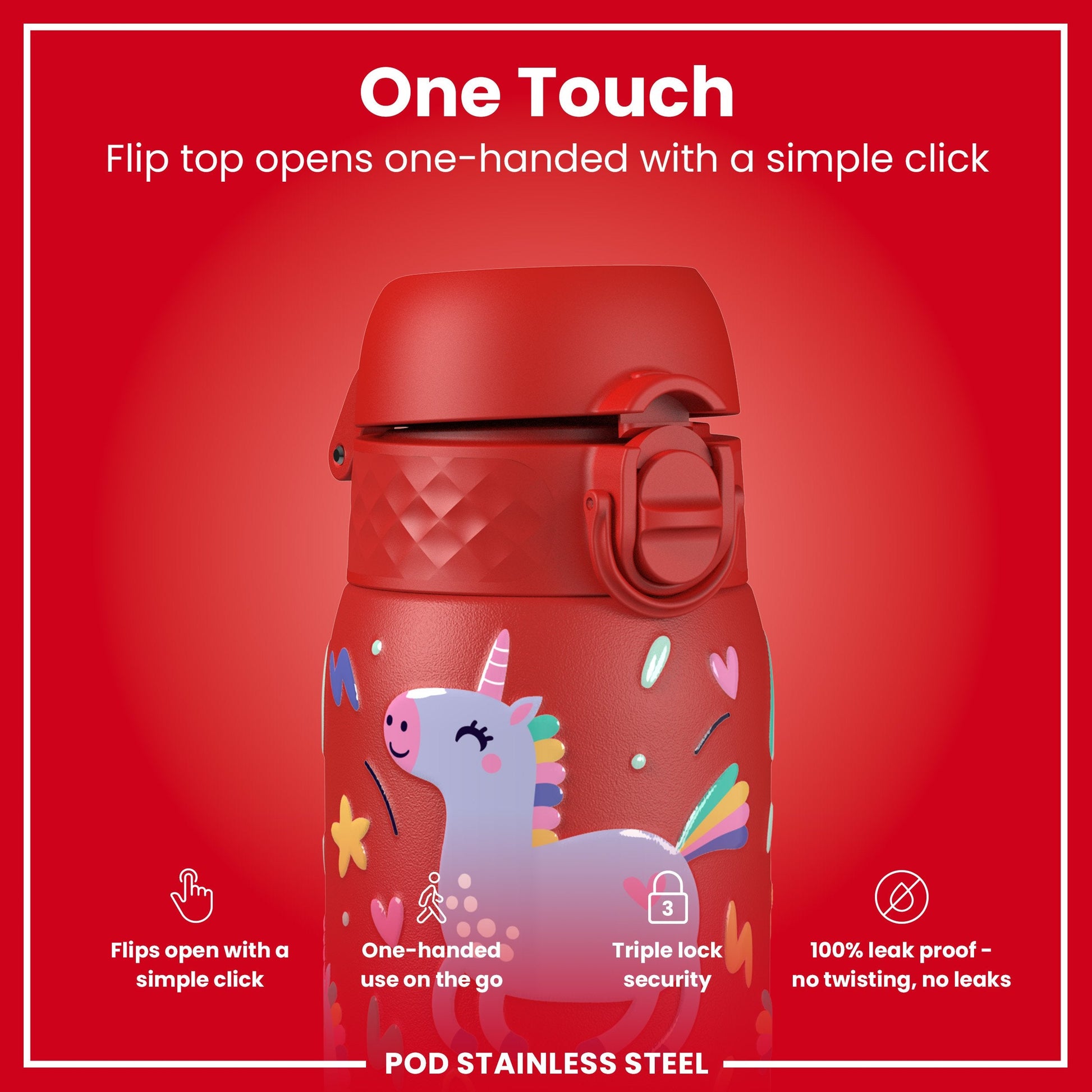 Leak Proof Kids Water Bottle, Stainless Steel, Red Unicorns, 400ml (13oz)