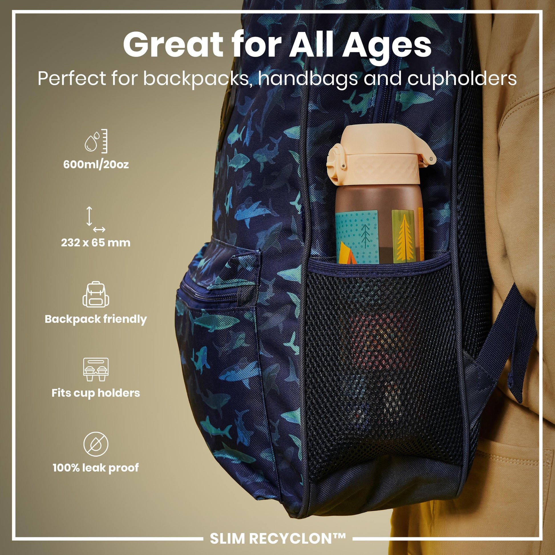 Small enough as a kids water bottle for their school lunch boxes or for smaller bags about town. The width of a soda can, it fits perfectly into all car cup holders and pockets on all backpacks.