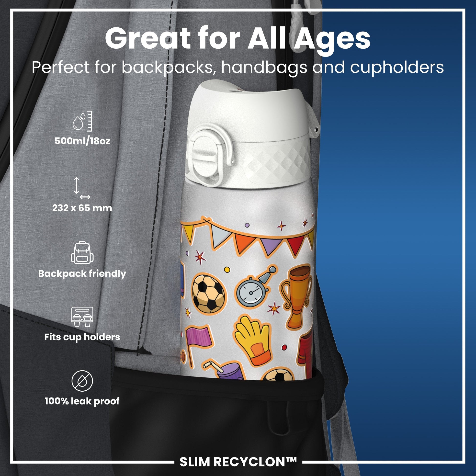 Leak Proof Slim Water Bottle, Recyclon, Football, 500ml (18oz)
