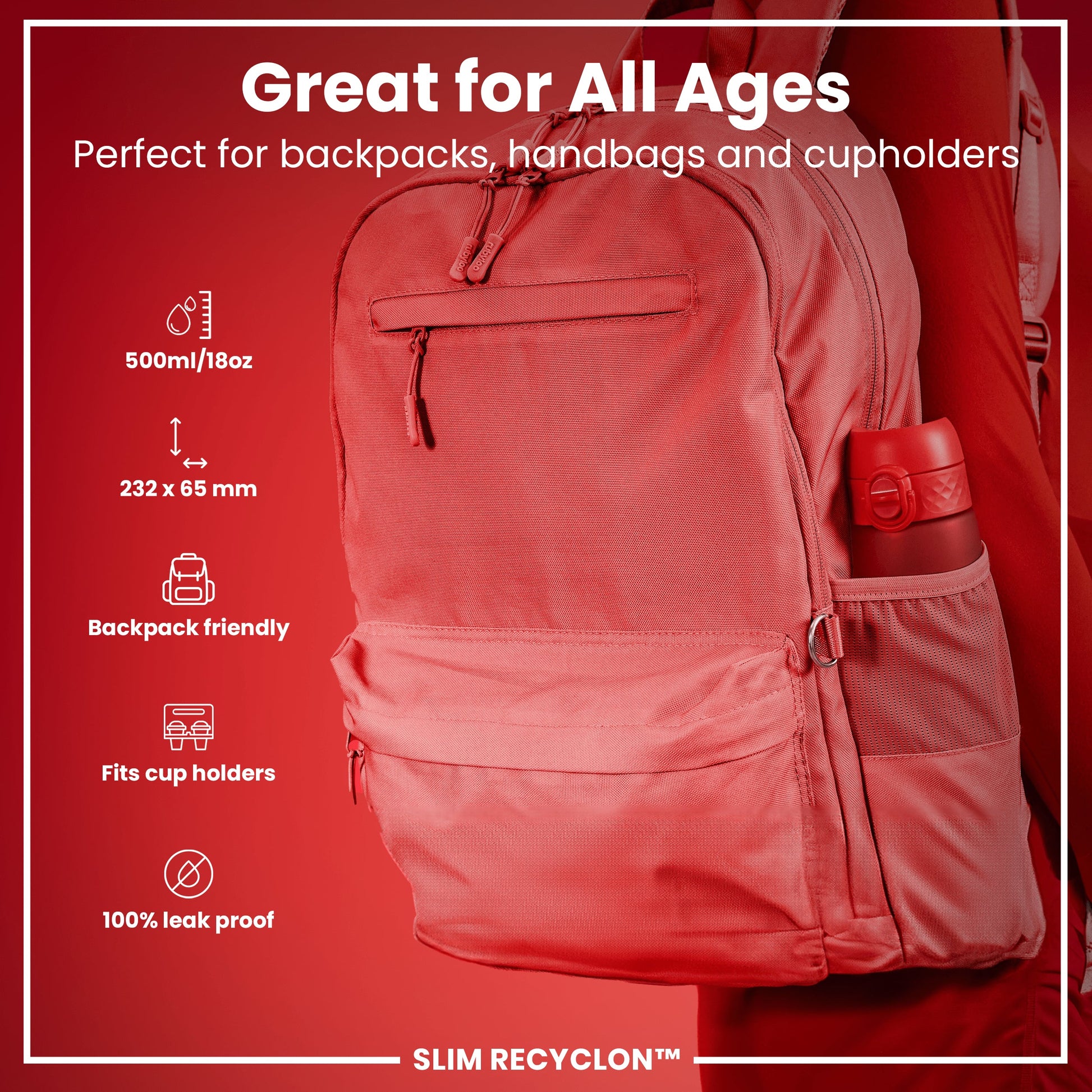 Leak Proof Slim Water Bottle, Recyclon, Red, 500ml (18oz)
