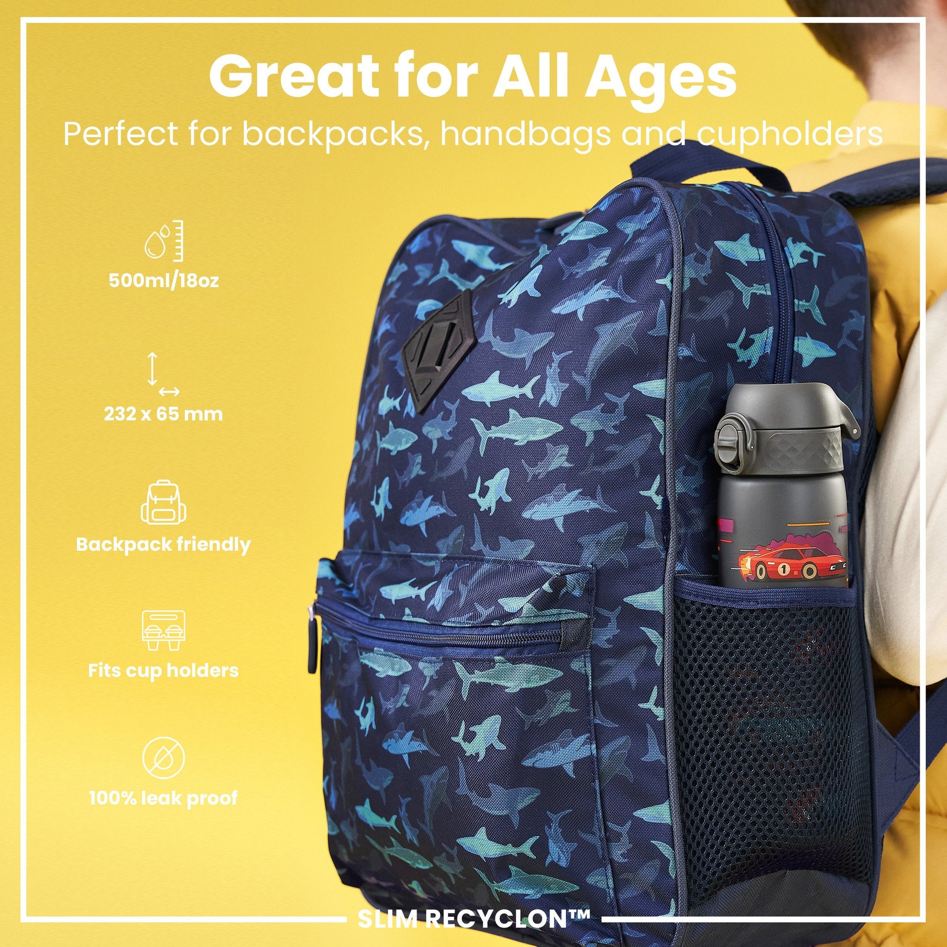 Leak Proof Slim Water Bottle, Recyclon, Sport Cars, 500ml (18oz)
