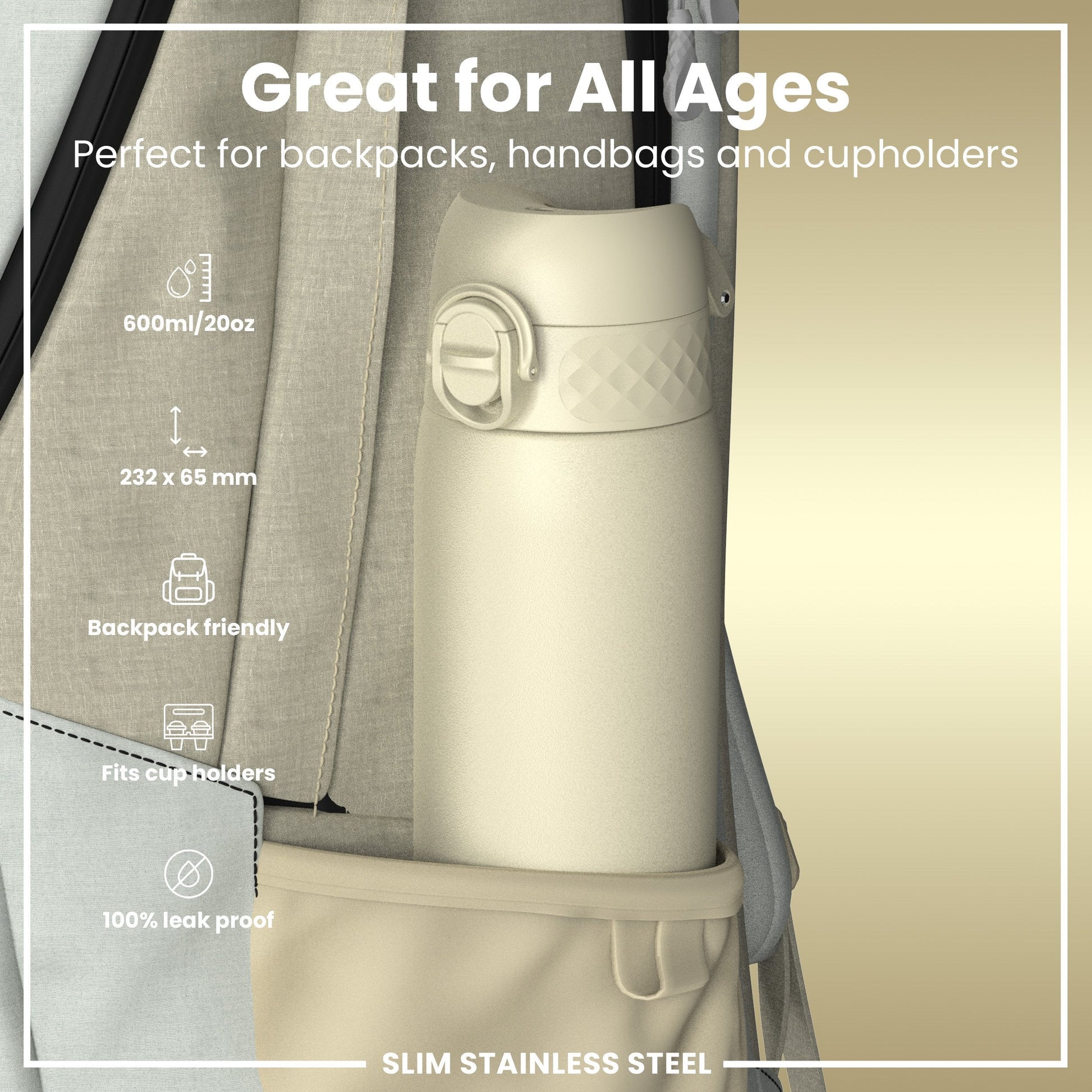Leak Proof Slim Water Bottle, Stainless Steel, Creamy White, 600ml (20oz)