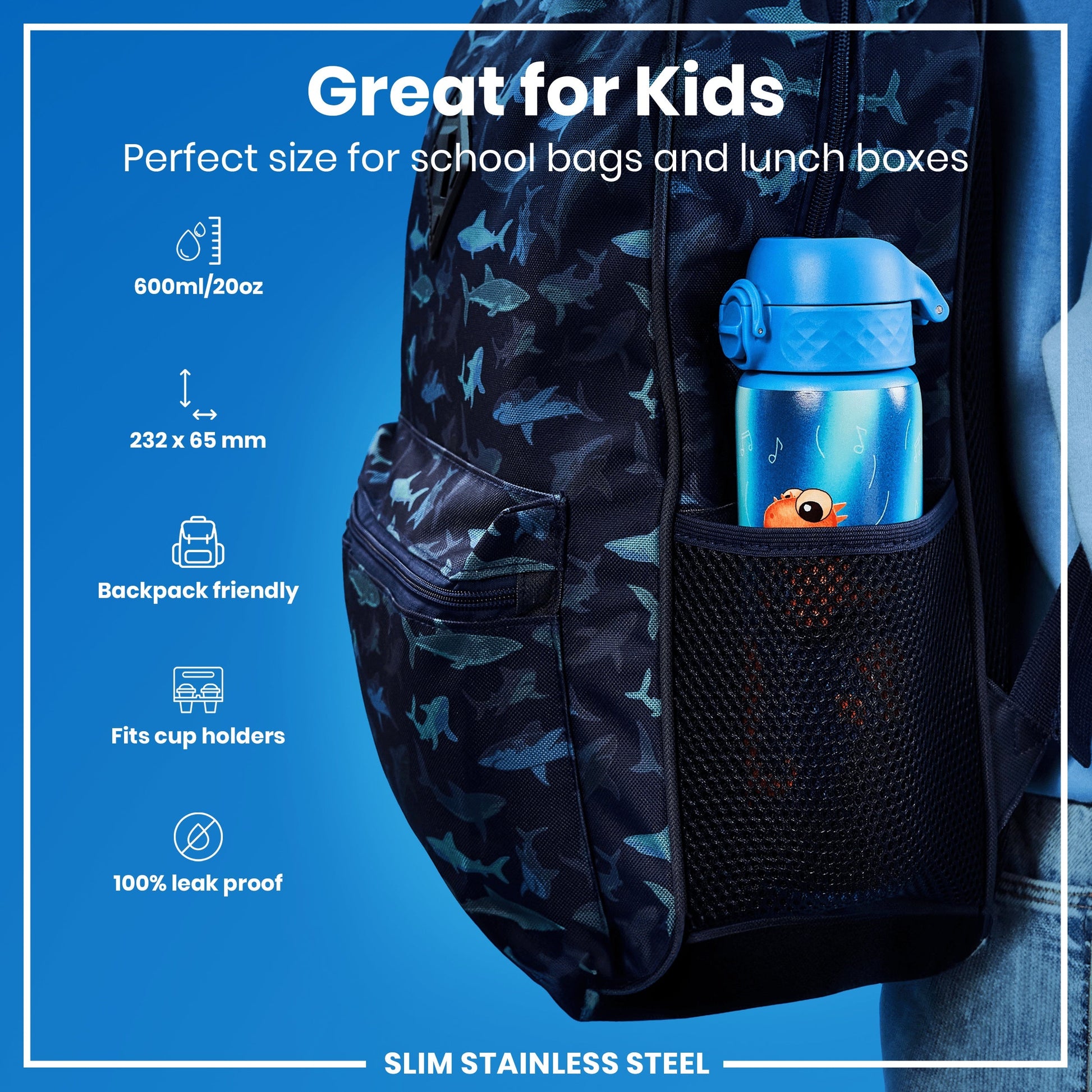 The perfect replacement for single use disposable cups. Small enough as a kids water bottle for their school lunch boxes or for smaller bags about town. The width of a soda can, it fits perfectly into all car cup holders and pockets on all backpacks.