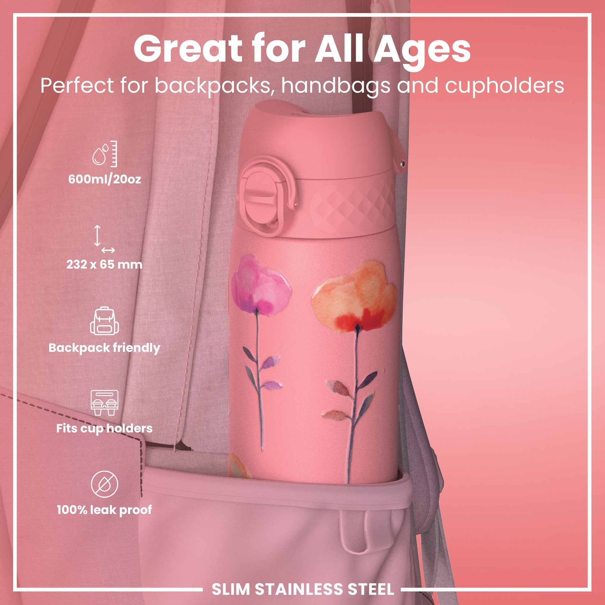 Flowers 600ml Leak Proof Slim Water Bottle