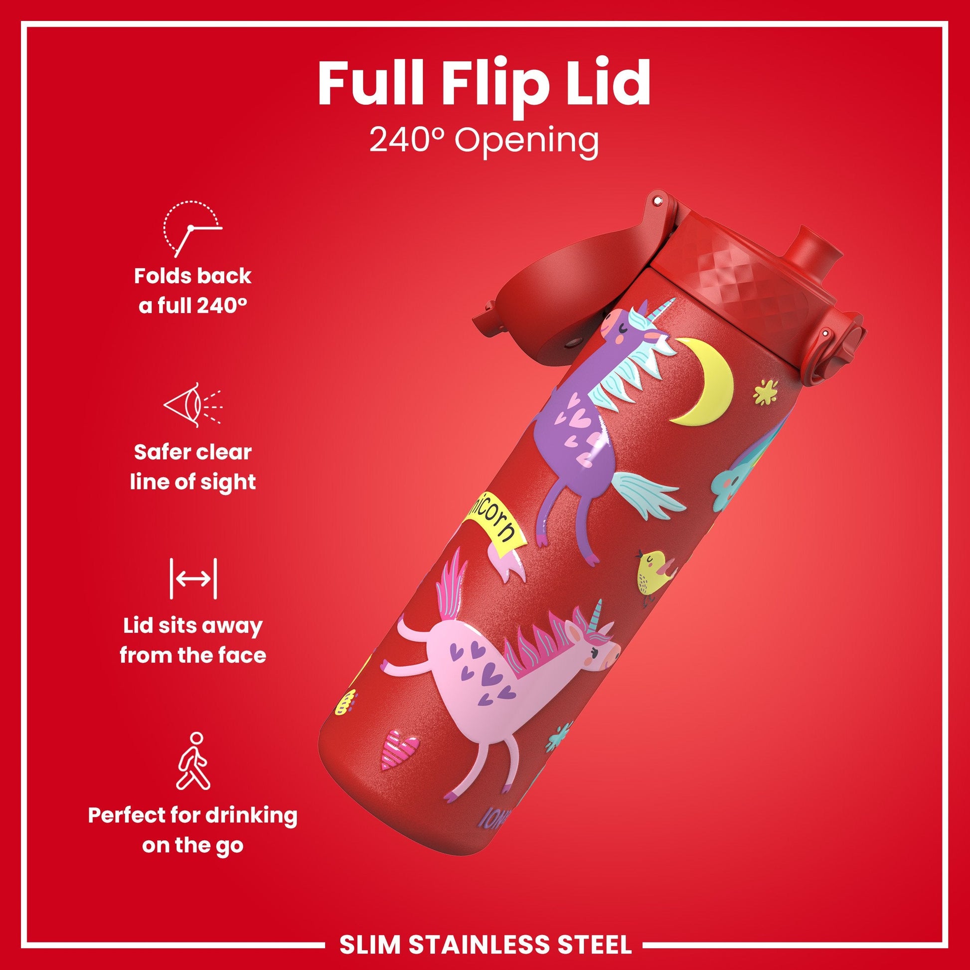 Leak Proof Slim Water Bottle, Stainless Steel, Red Unicorns, 600ml (20oz)