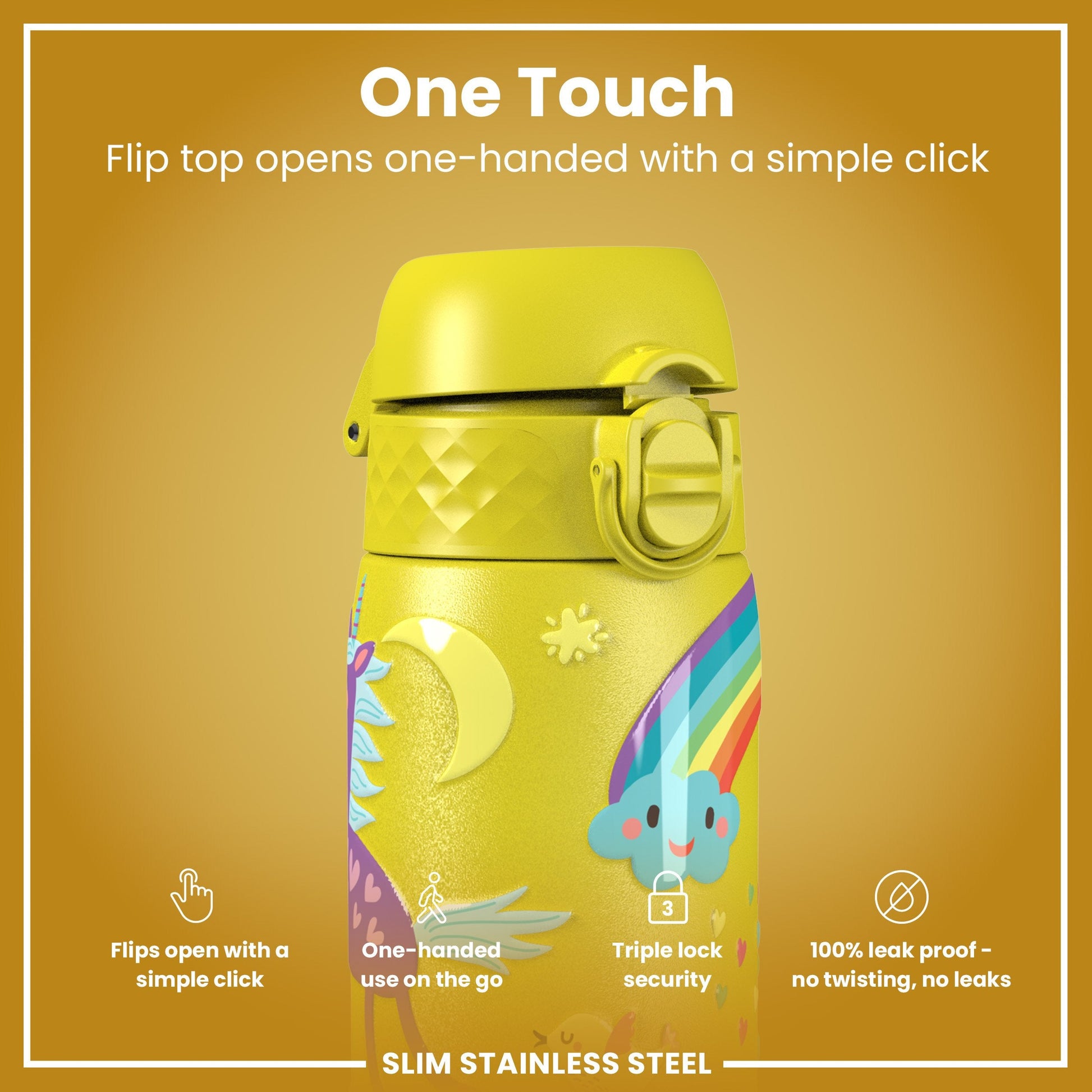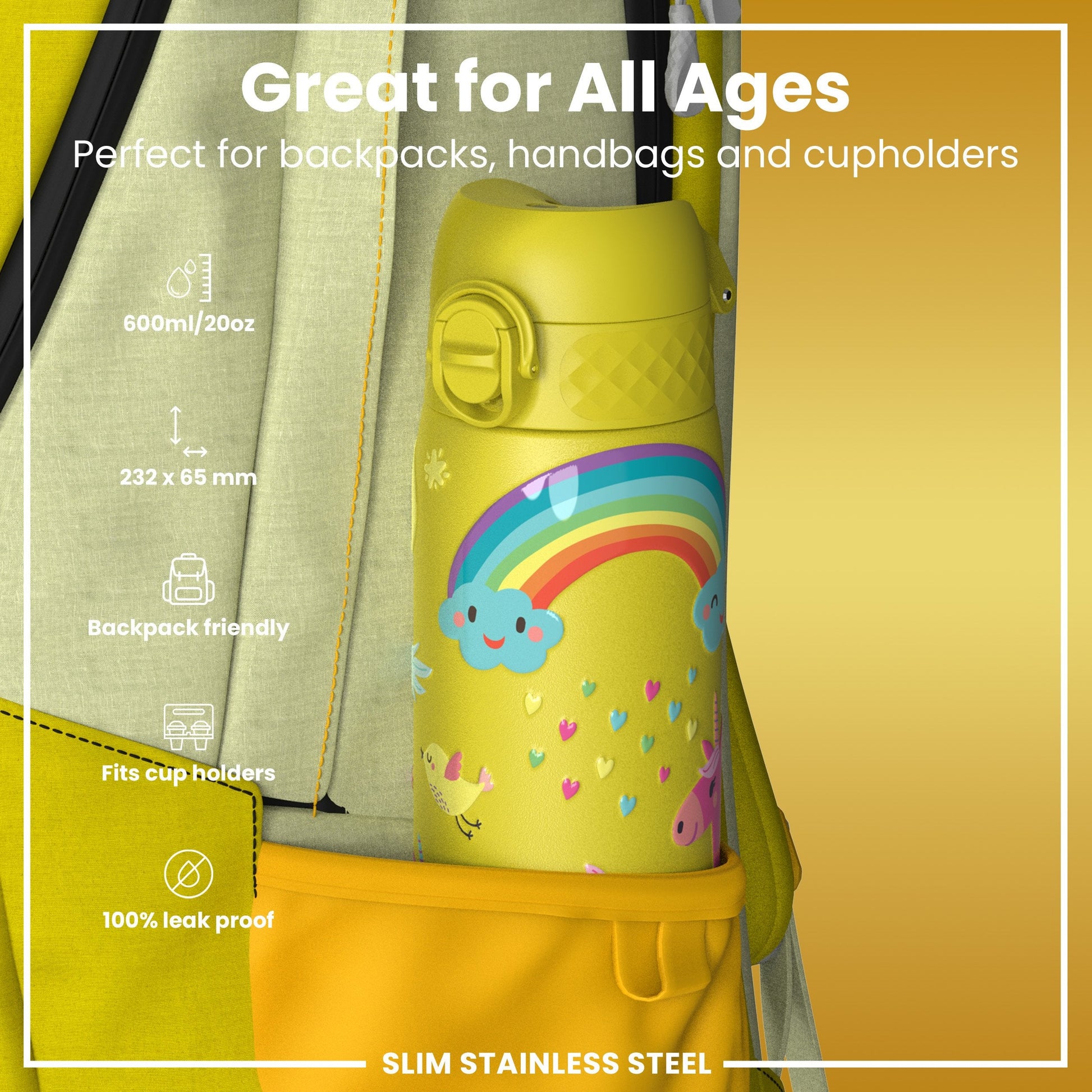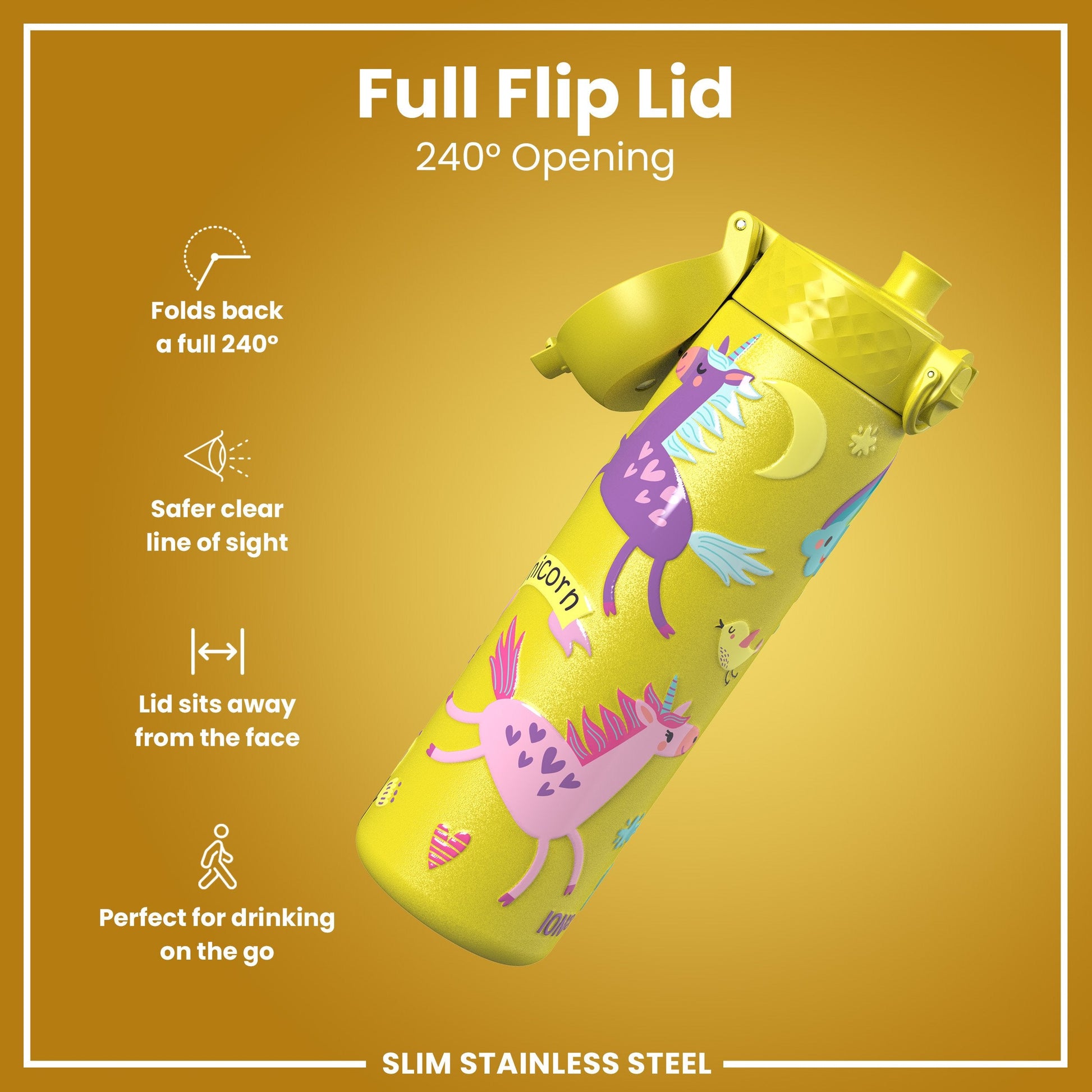Leak Proof Slim Water Bottle, Stainless Steel, Yellow Unicorns, 600ml (20oz)