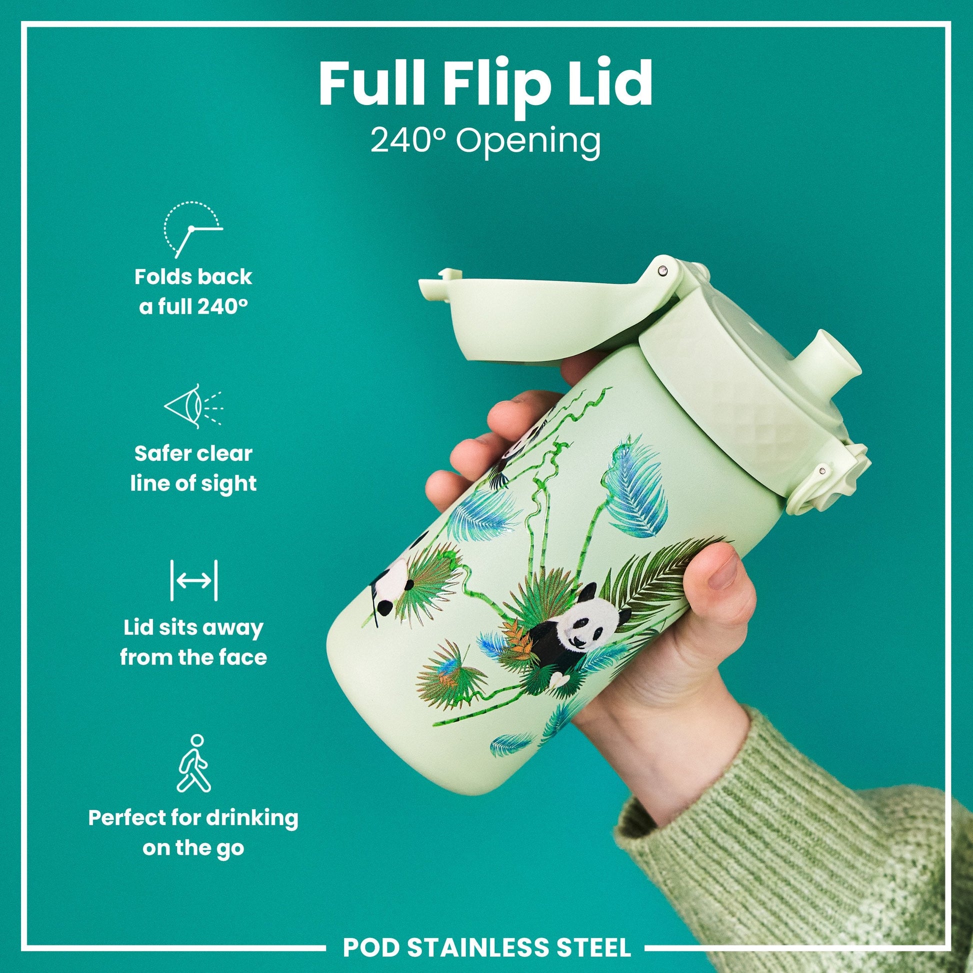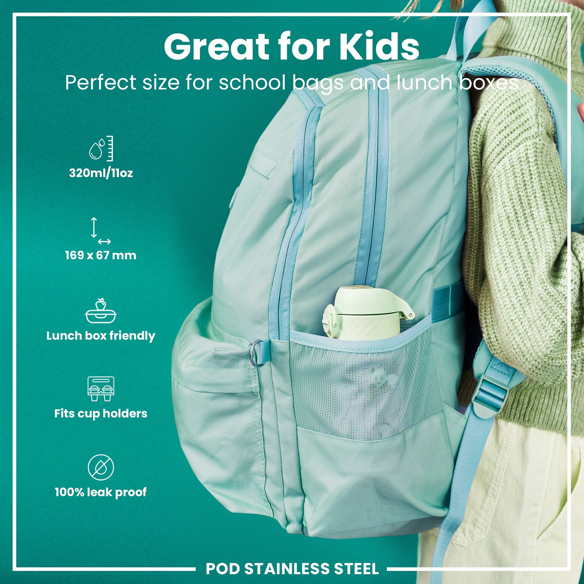 100% leak proof 320ml / 11oz kids vacuum insulated double wall stainless steel water bottles with a smooth flow for spill-free hydration and hygienic full-flip top cover for one handed use on-the-go. Keeps hot drinks hot and cold drinks icy cold and fresh for hours.