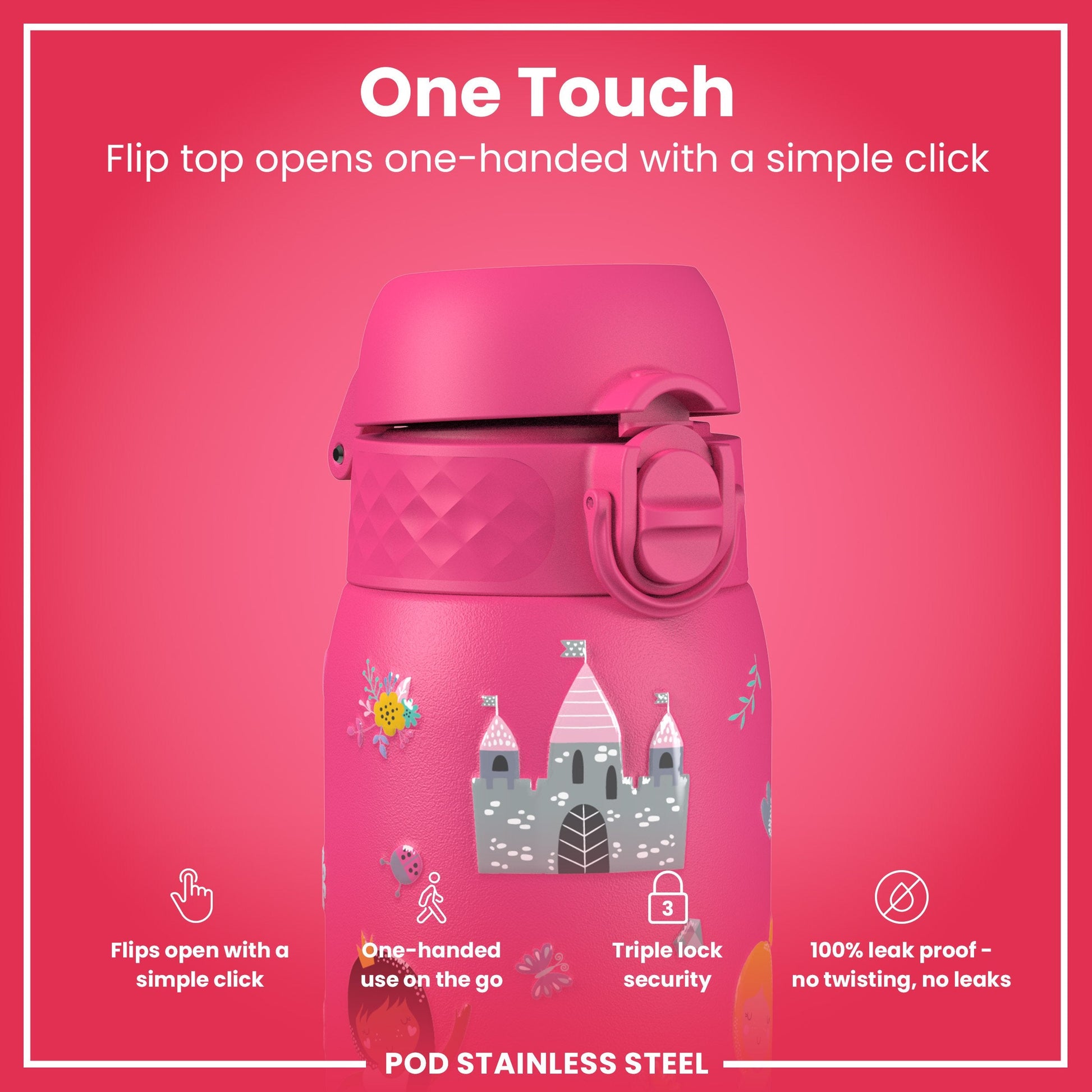 100% leak proof 320ml / 11oz kids vacuum insulated double wall stainless steel water bottles with a smooth flow for spill-free hydration and hygienic full-flip top cover for one handed use on-the-go. Keeps hot drinks hot and cold drinks icy cold and fresh for hours.