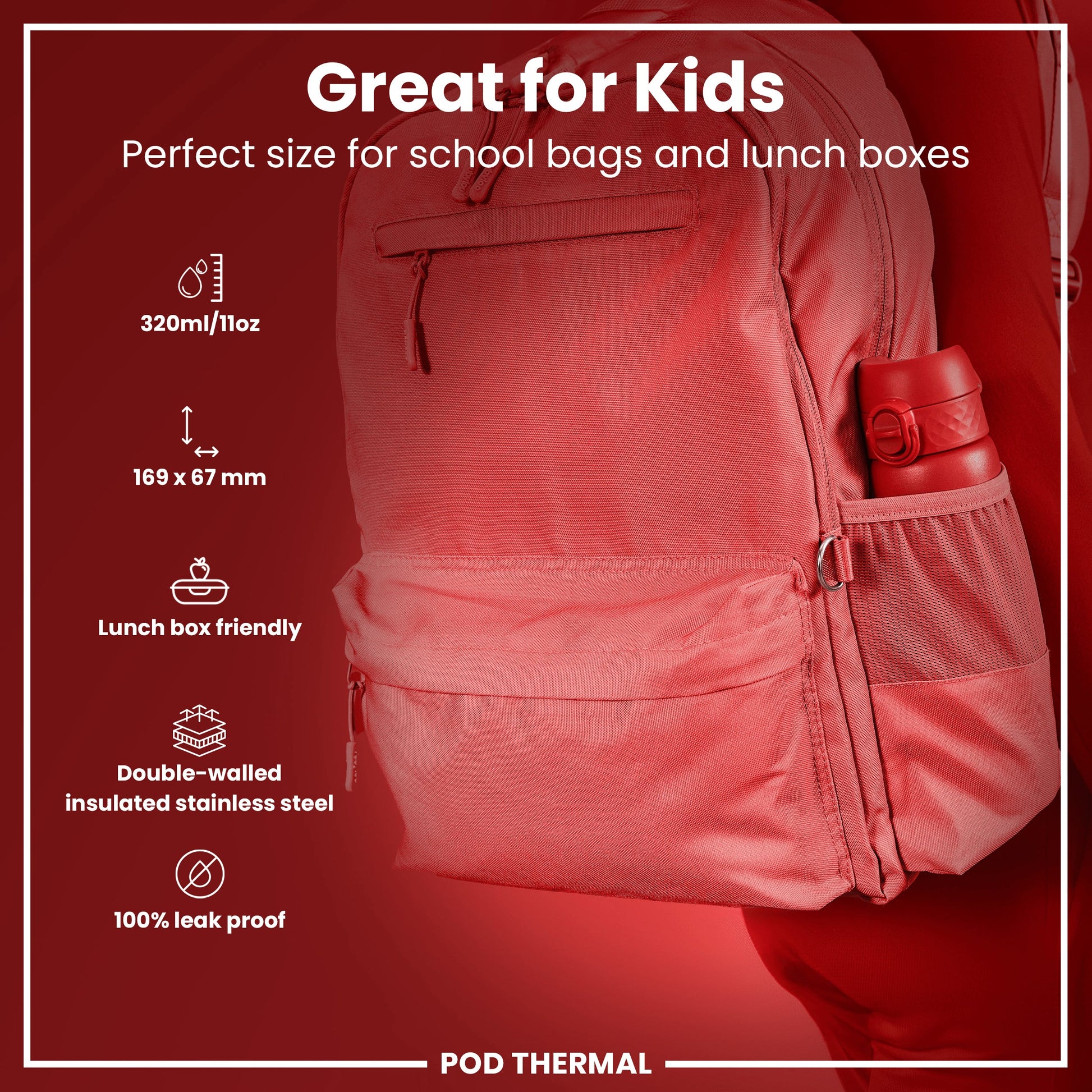 The perfect replacement for single use disposable cups. Small enough as a kids water bottle for their school lunch boxes or for smaller bags about town. The width of a soda can, it fits perfectly into all car cup holders and pockets on all backpacks.