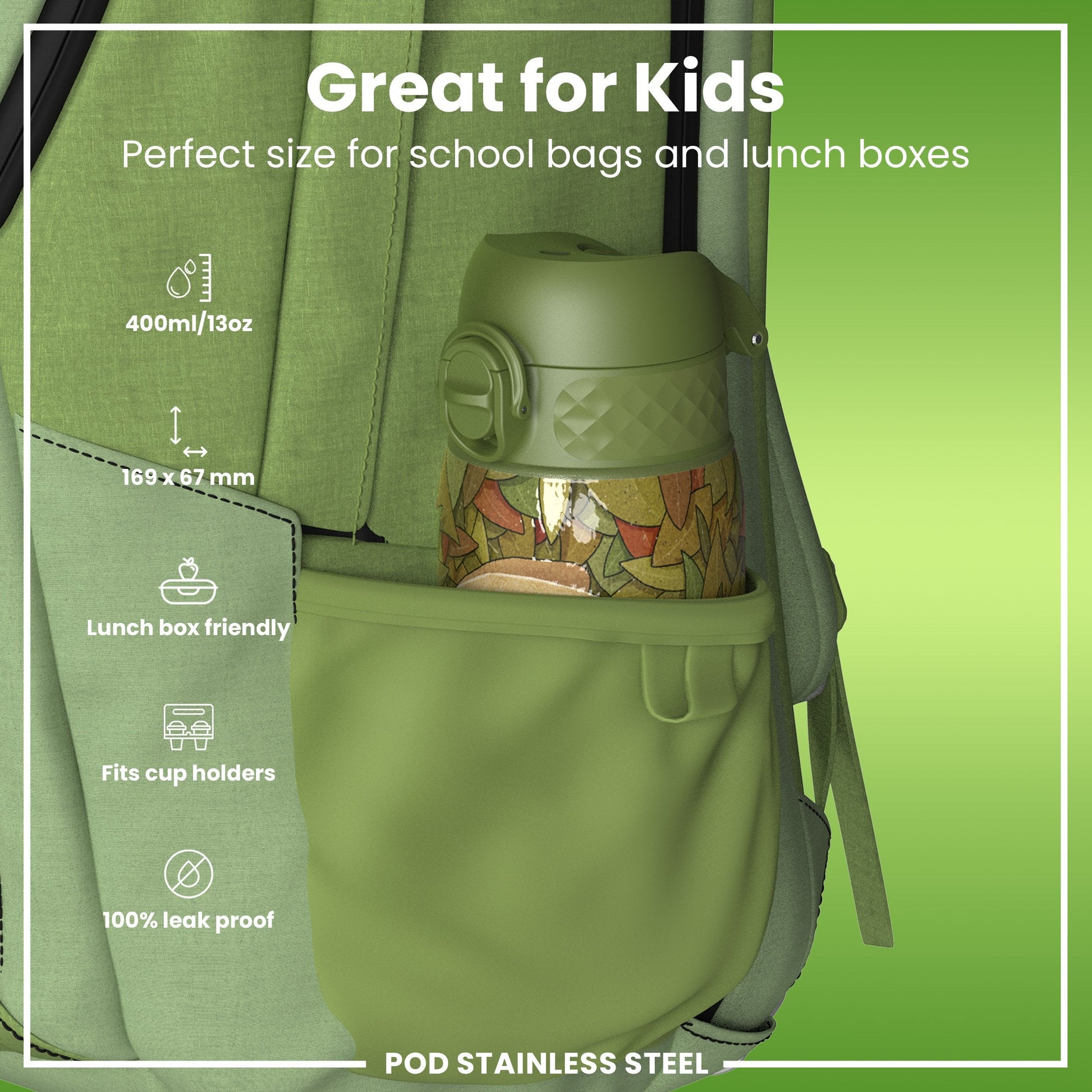 100% leak proof 400ml / 13oz stainless steel water bottles with a smooth flow for spill-free hydration and hygienic full-flip top cover for one handed use on-the-go.