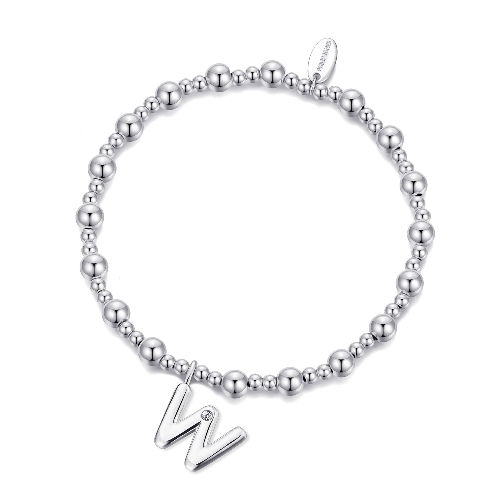 Elevate your style with this captivating Philip Jones initial stretch bracelet created with stunning Zircondia crystals. Crafted with hypoallergenic silver plated brass alloy, this bracelet boasts a high polished finish for a luxurious look. The initial charm adds a personal touch to this bracelet, which can be stretched to fit perfectly at 17.8cm to 19.3cm. This bracelet is lightweight and comfortable to wear. The clear, round Zircondia crystals add a touch of sparkle and are carefully packaged in a gift pouch, making it the perfect gift.