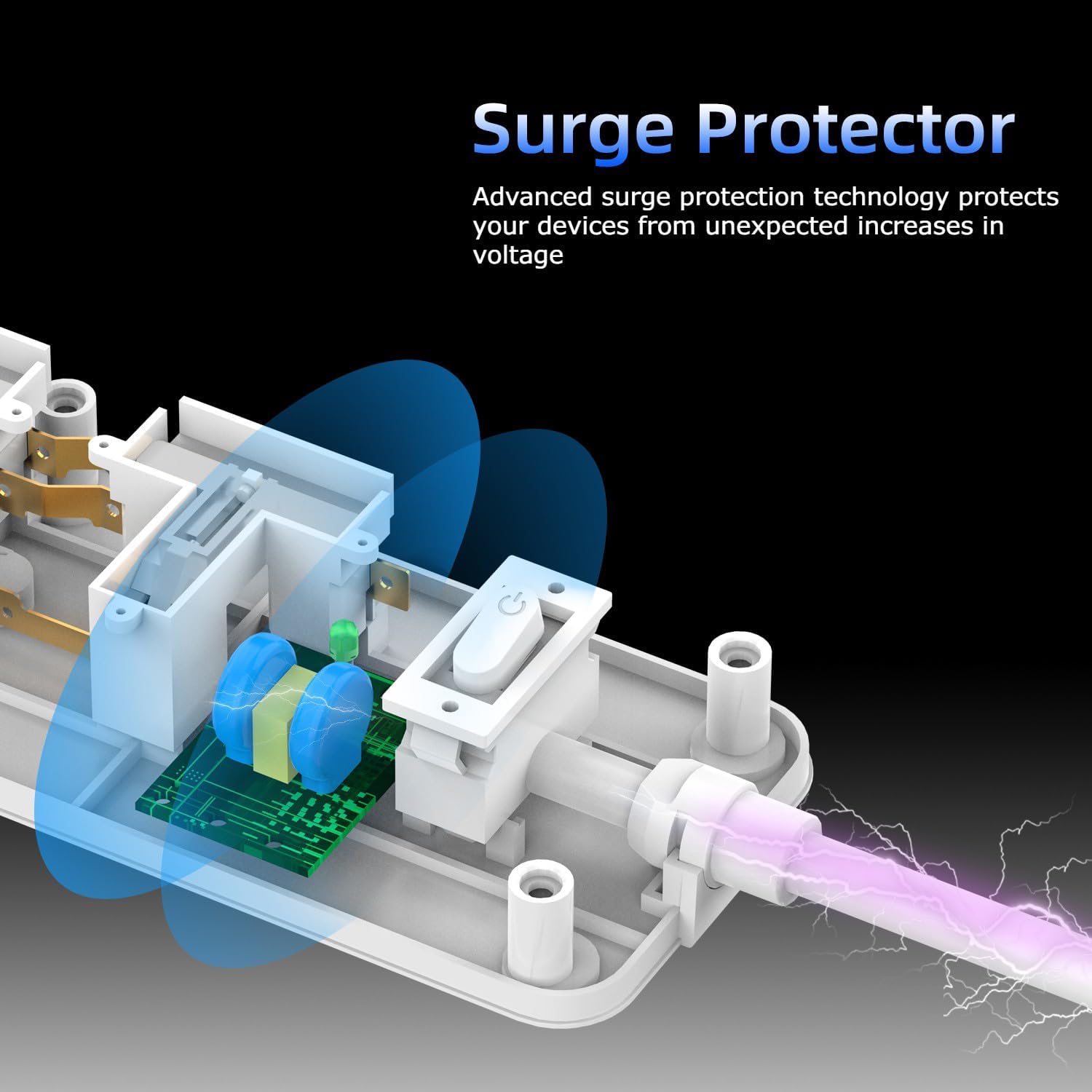 Built with surge protection and overload protection, it safeguards your connected devices from unexpected voltage spikes and electrical surges. The integrated USB outputs provide a total of 5V 3A, allowing you to charge smartphones, tablets, and other USB devices directly – without needing extra adapters.