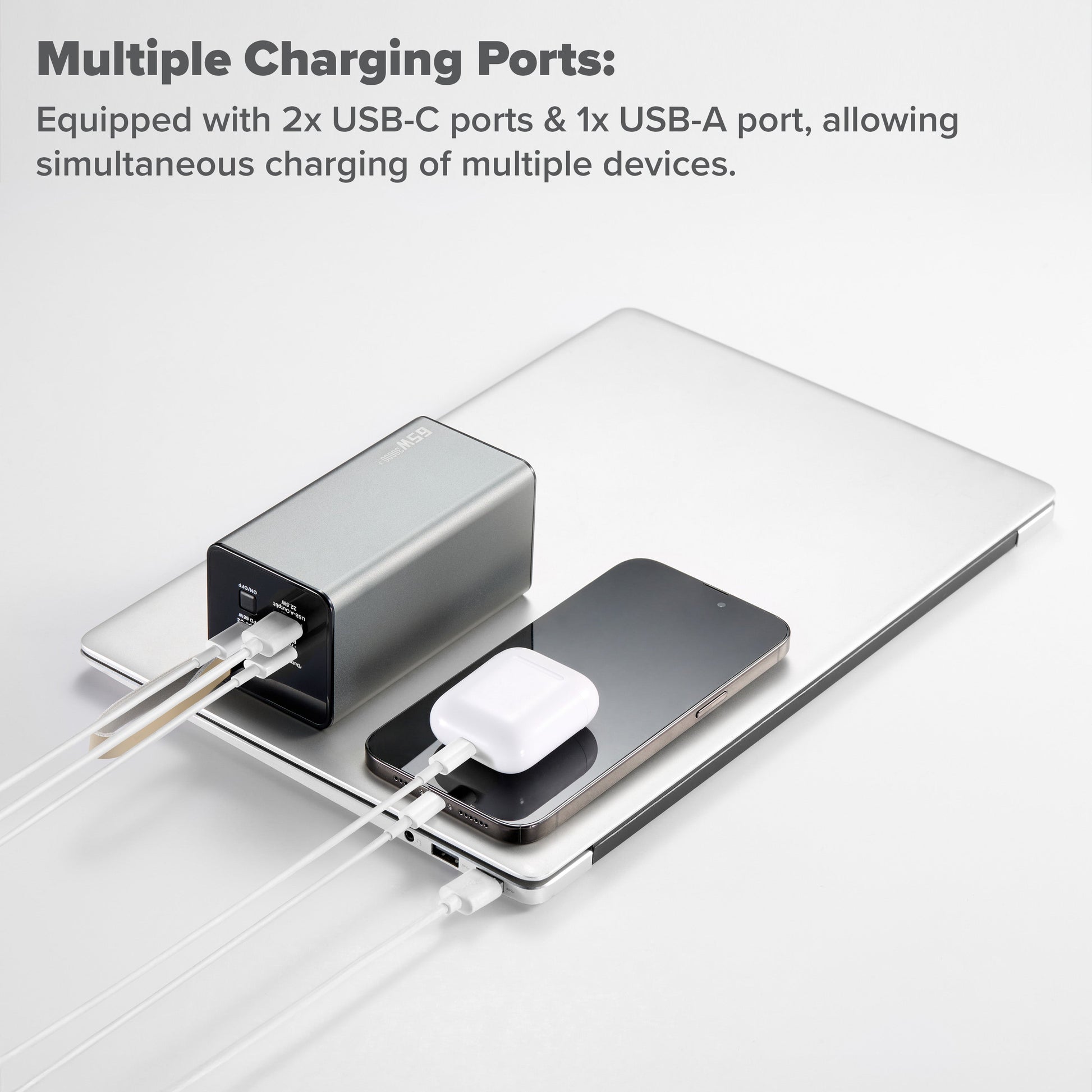The Power Bank features 2x 65W PD USB-C ports and a High Speed USB-A port for charging a wide range of devices. Its Li-Polymer battery charges quickly and is ideal for repeated use. An LED display shows the power available.
