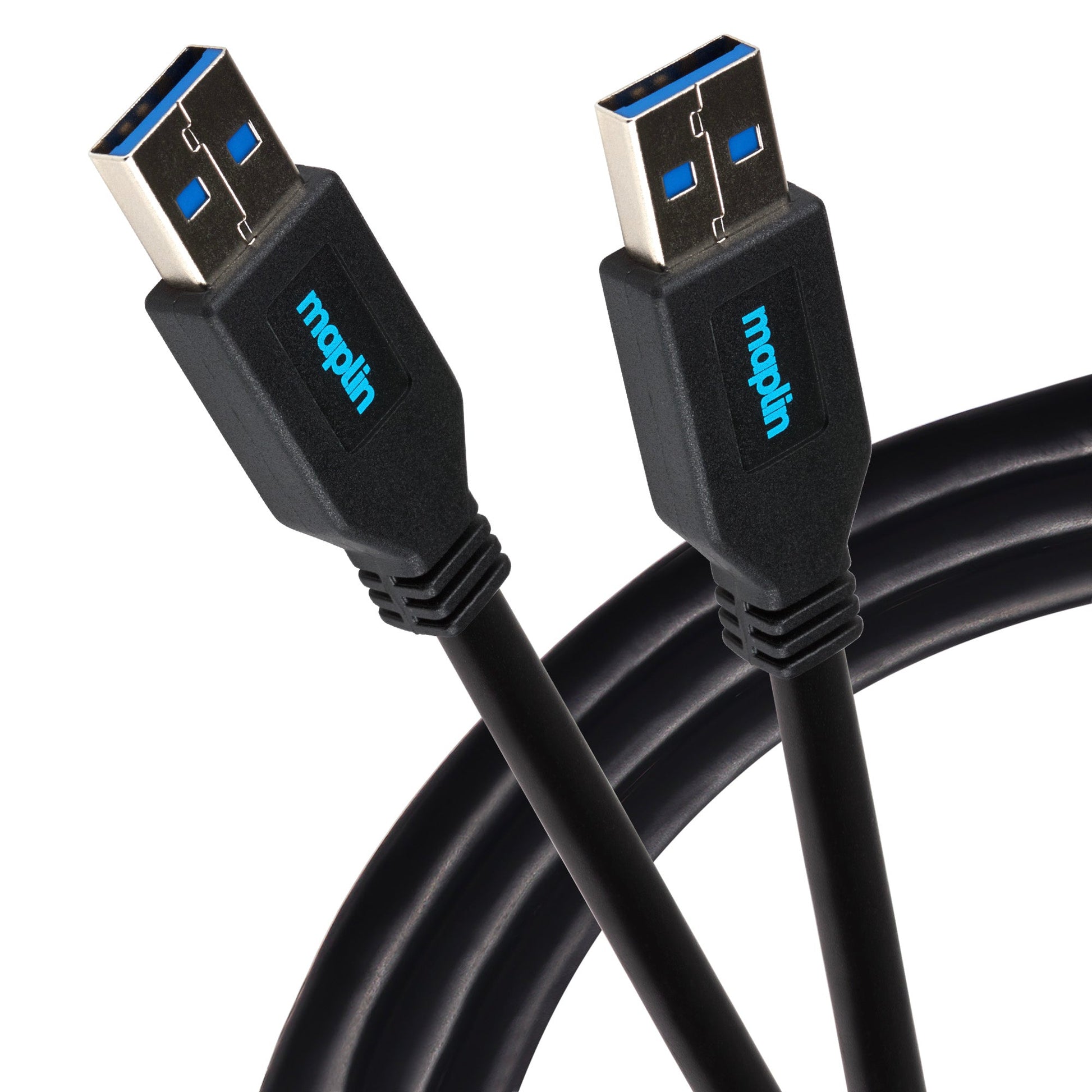This Maplin Super Fast USB-A 3.0 to USB-A 3.0 Super Speed 5Gbps Cable uses a male USB-A 3.0 to male USB-A 3.0 connector and is uncommonly used to connect devices that use a female USB-A 3.0 port in place of micro or mini connections.