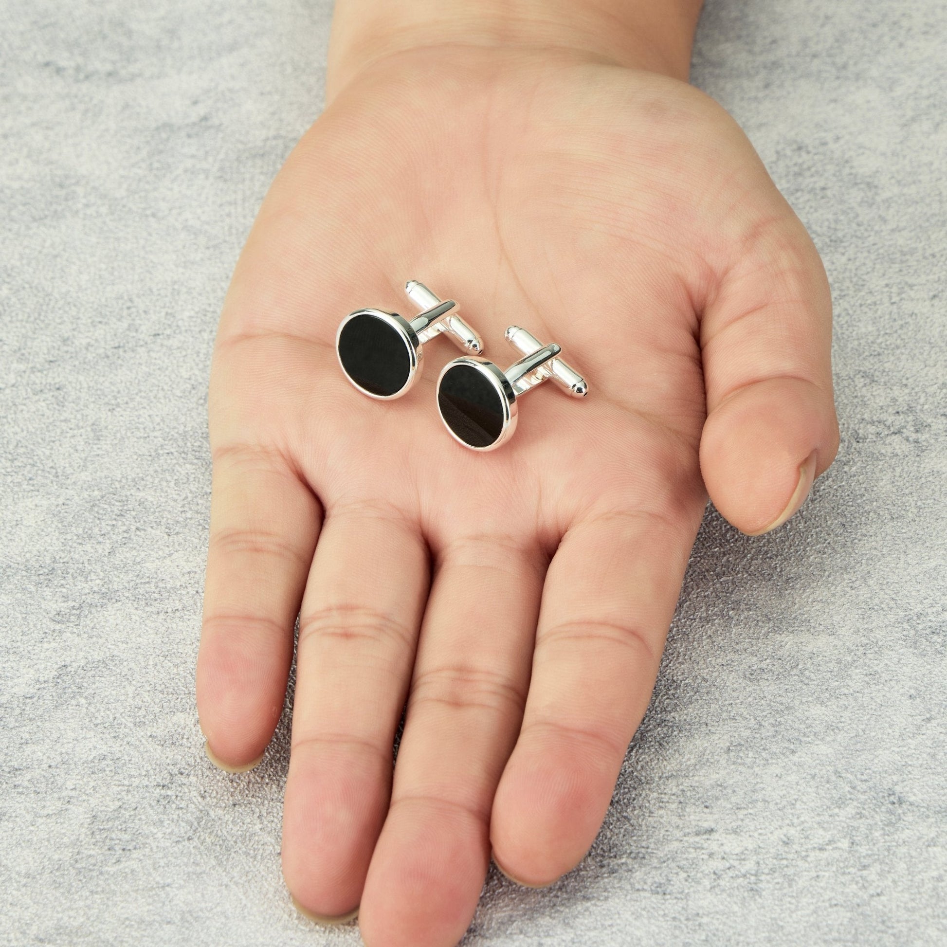 Experience luxury and excellence with these Men's Black Onyx Gemstone Cufflinks. Made with genuine gemstones and featuring a silver plated high polished finish, these cufflinks are both stylish and hypoallergenic. Measuring 16mm in both height and width, with a weight of 9.63g, they boast a round Onyx stone in a captivating black colour. Comes in a gift pouch. Elevate your fashion game and make a statement with these Philip Jones cufflinks.
