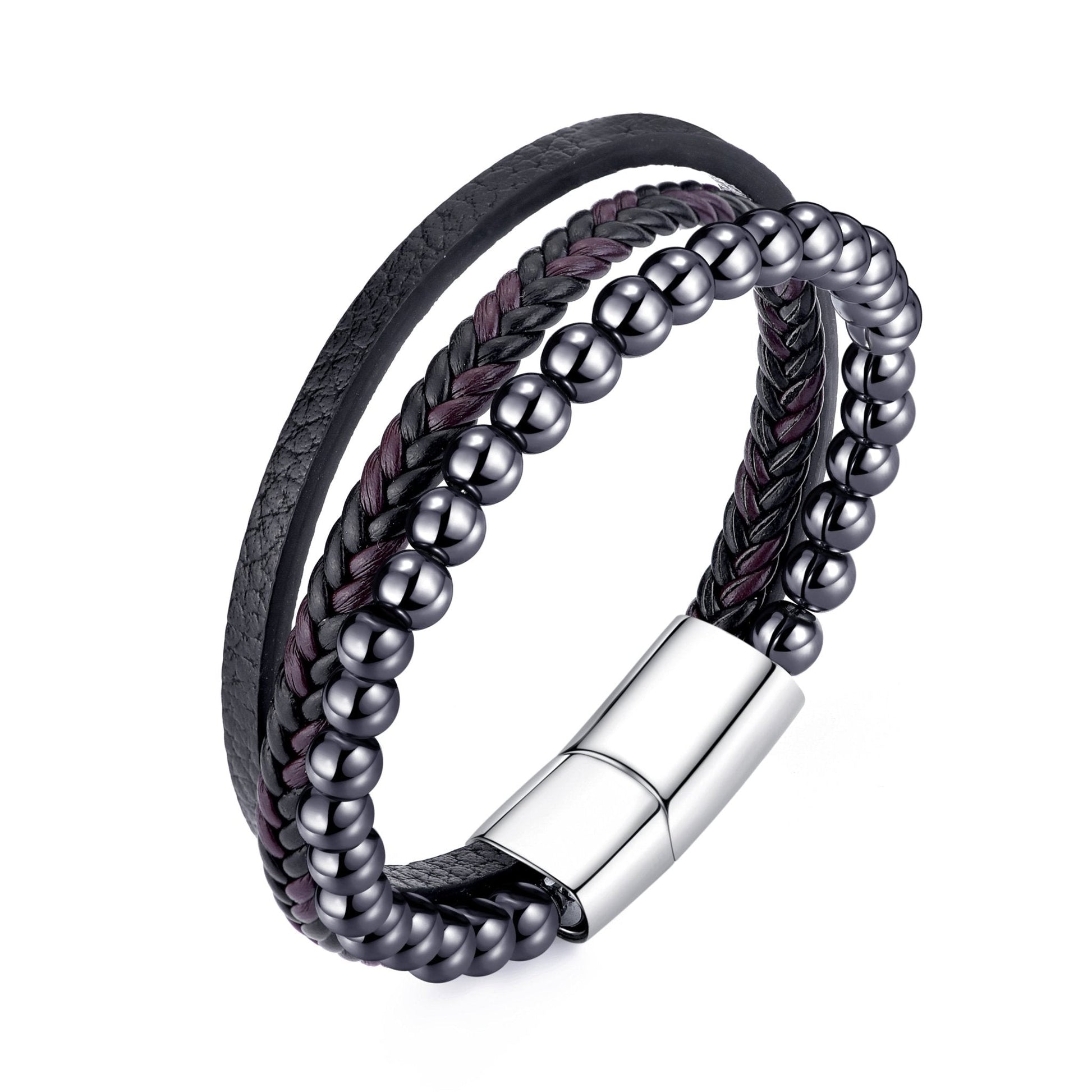 A timeless men's bracelet, crafted from genuine leather and polished stainless steel. Featuring a hypoallergenic, magnetic closure and hematite stone, this bracelet is simple, yet classic. Elegant and durable, it's the perfect accessory for any man looking to make a sophisticated impression.