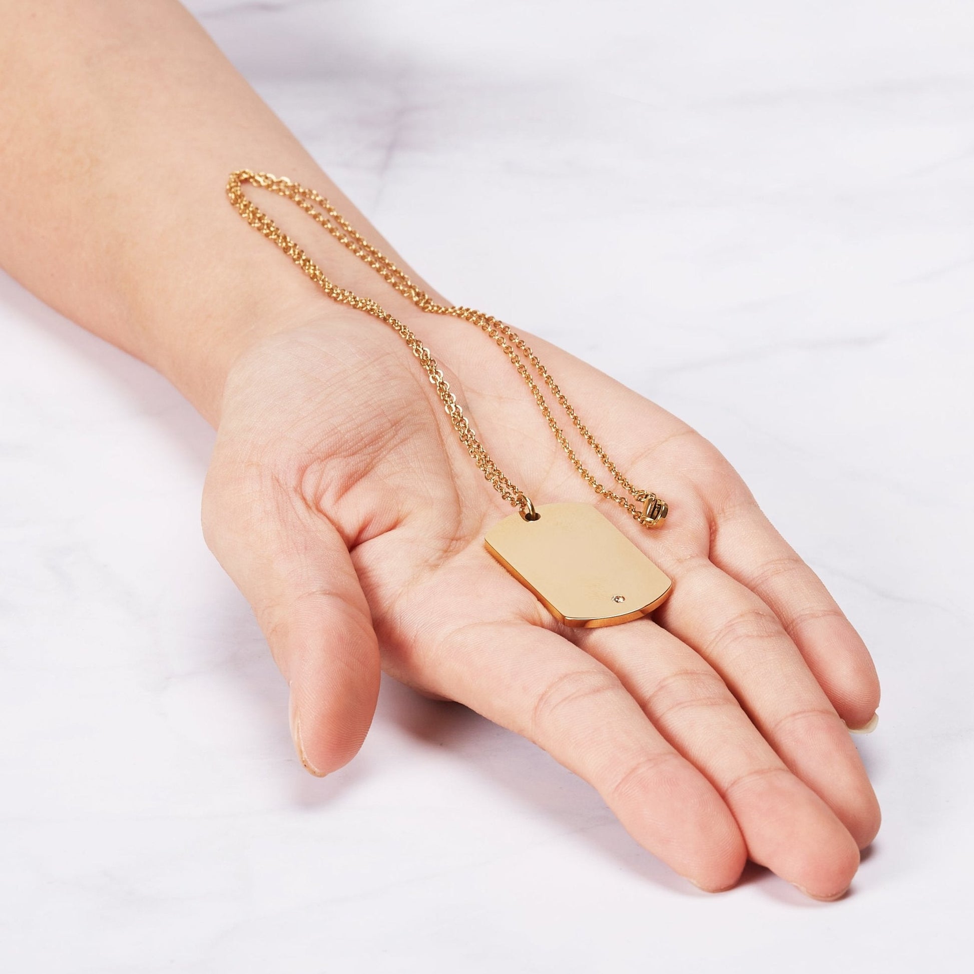 Become the ultimate statement of style with this spectacular Men's Gold Plated Steel Dog Tag Necklace Created with Zircondia® Crystals. Made with stainless steel and Philip Jones brand, its lobster claw closure and 50cm cable chain make this elegant and timeless piece a must-have. The dazzling Zircondia® Round Clear Crystals give a special touch to the 35mm (H) x 21mm (W) pendant that weighs a light 12.3g. Make a statement with this luxurious necklace!