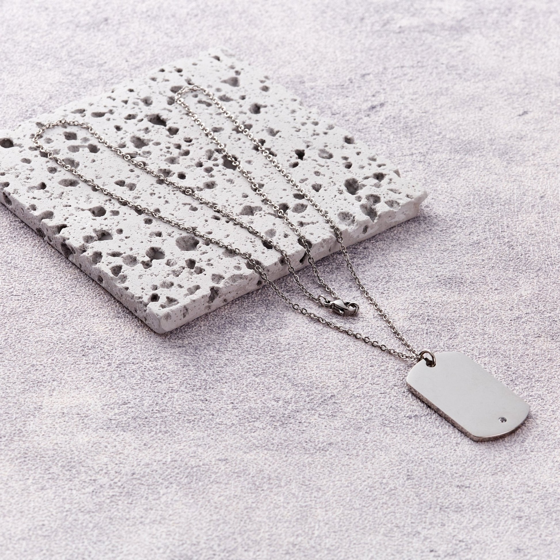 This Men's Stainless Steel Dog Tag Pendant Necklace from Philip Jones is truly unique. Crafted from stainless steel & featuring 1mm Zircondia® crystals, the 35mm x 21mm pendant is suspended from a 50cm cable chain & secured with a lobster claw clasp. Its fashionable & eye-catching design is sure to turn heads - make it your go-to accessory!