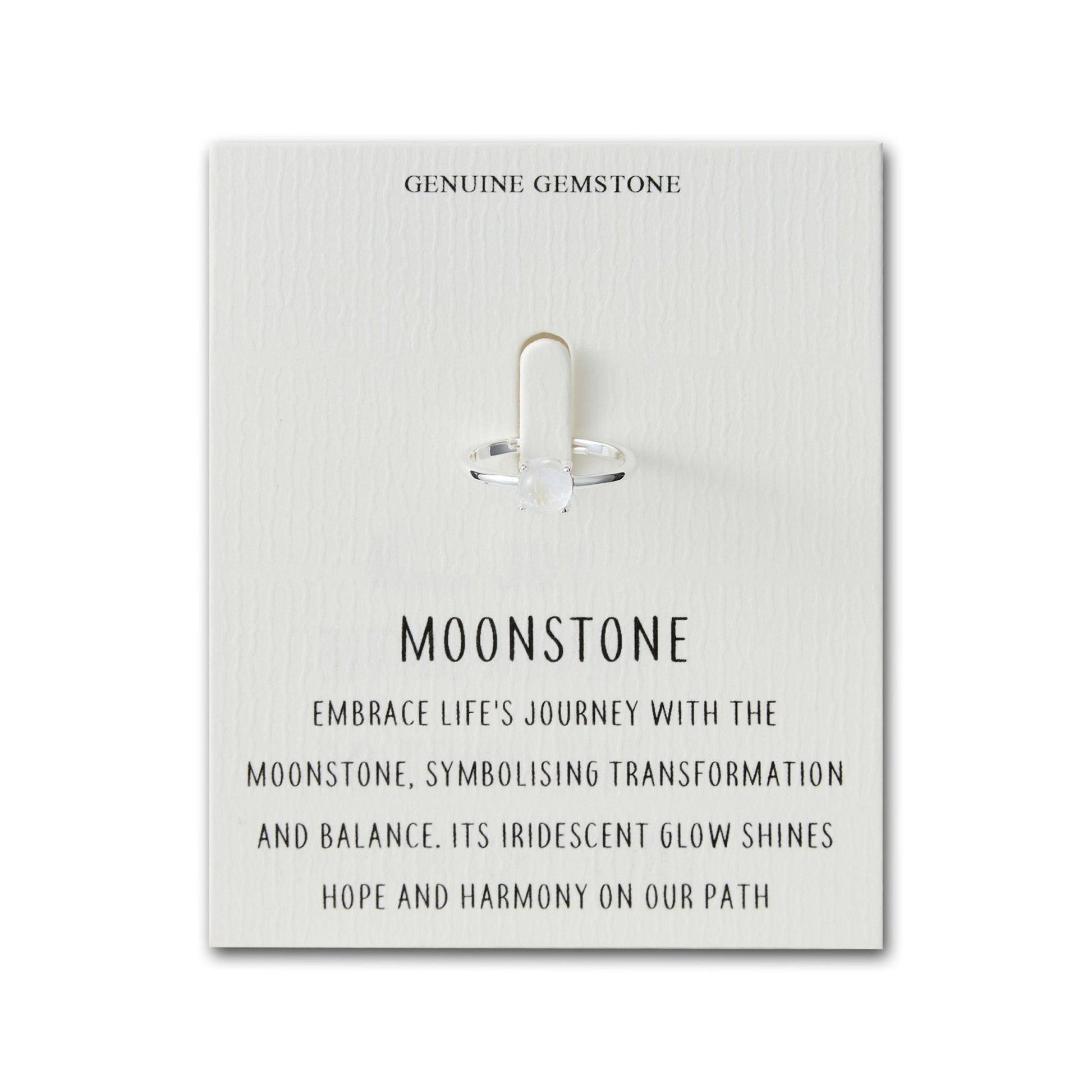 Sparkle with elegance and charm with the Philip Jones Moonstone Adjustable Ring! This exquisite piece is made with genuine gemstones and plated with silver for a stunning and hypoallergenic finish. With an adjustable band and 6mm moonstone, it's perfect for all sizes and occasions. Comes in a beautiful gift pouch with a quote card for added inspiration. Shop now and add this gem to your collection!