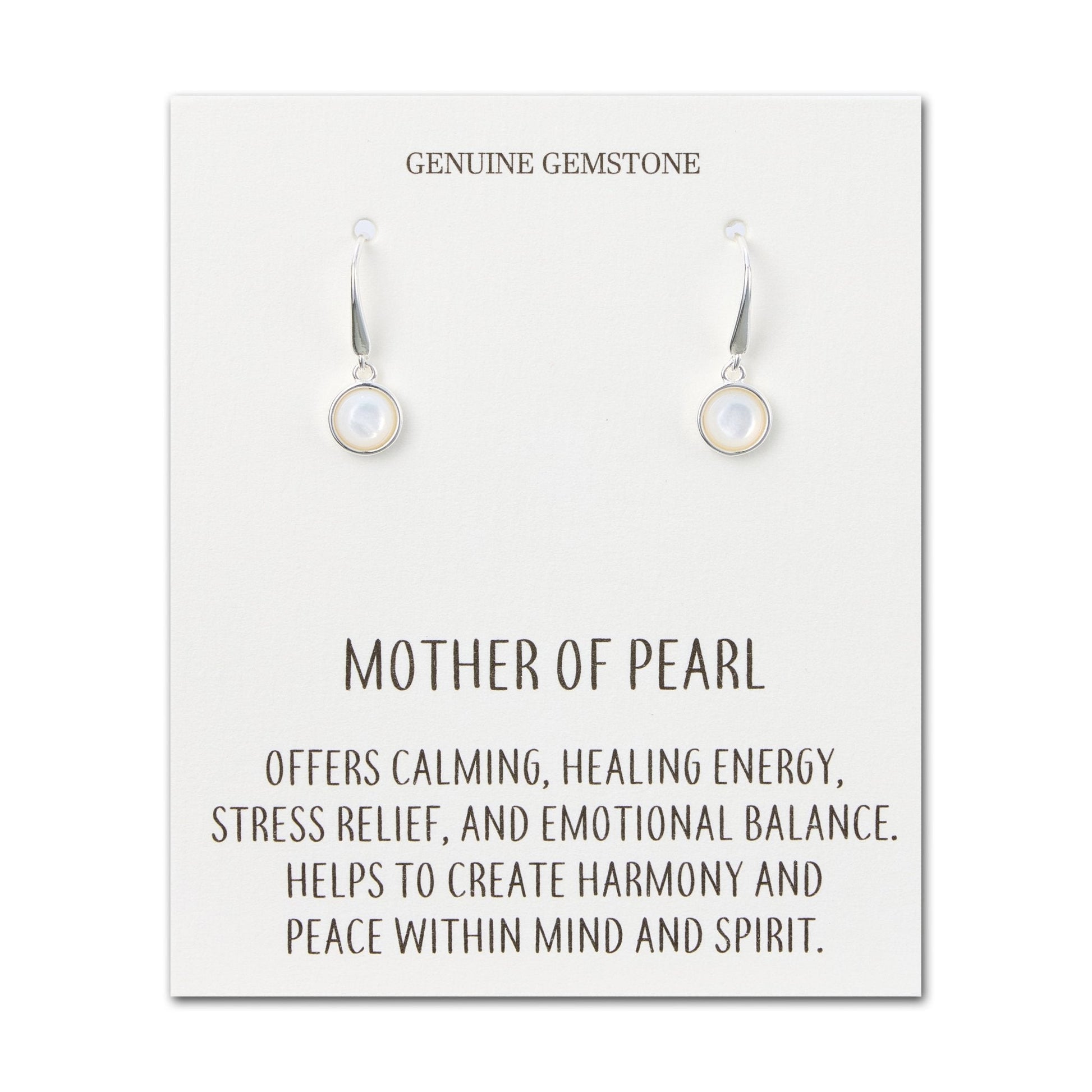 Elevate your style with these elegant Mother of Pearl drop earrings, crafted with genuine gemstones and silver plating for a radiant finish. Lightweight and hypoallergenic, they offer comfortable wear with a secure French hook closure. Each 20mm x 7mm earring features a 6mm round pearl, adding timeless beauty to any outfit. Presented in a charming gift pouch with an inspiring quote card, they make a perfect gift or a special treat for yourself.