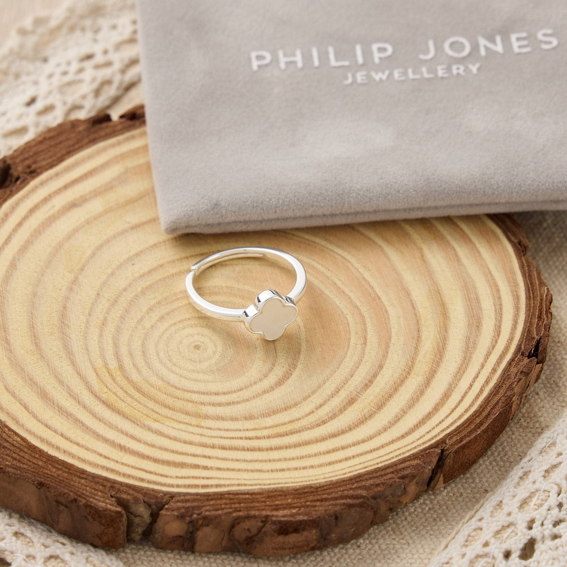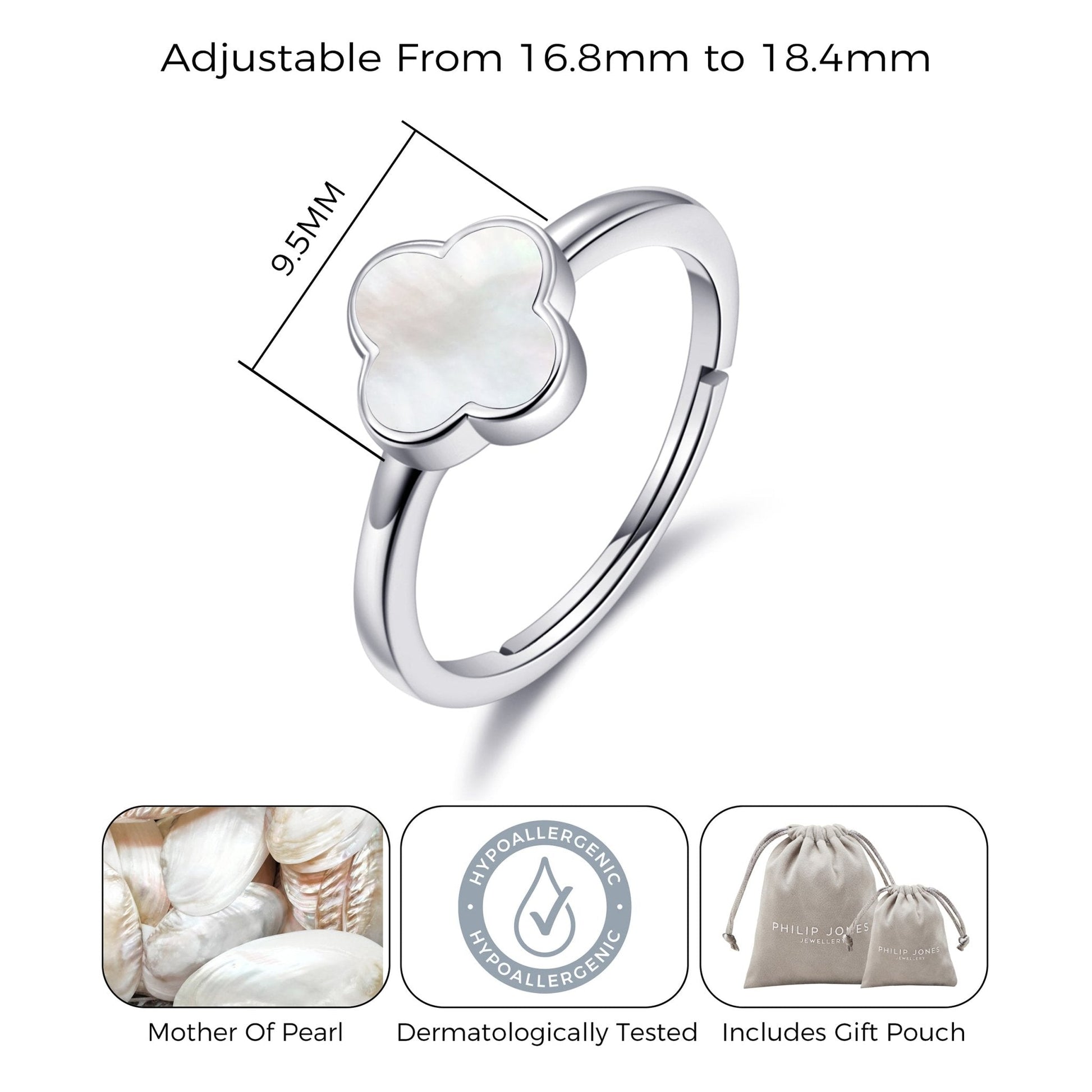 Elevate your style with our Silver Plated Clover Ring featuring authentic Mother of Pearl gemstone. This hypoallergenic piece showcases a stunning white 9mm clover-shaped stone on a brass alloy base. Conveniently adjustable from size M to Q with a delicate 2mm band. Each Philip Jones creation arrives in an elegant gift pouch, perfect for treating yourself or surprising someone special. The genuine gemstone's natural lustre catches light beautifully, adding sophisticated charm to any outfit.