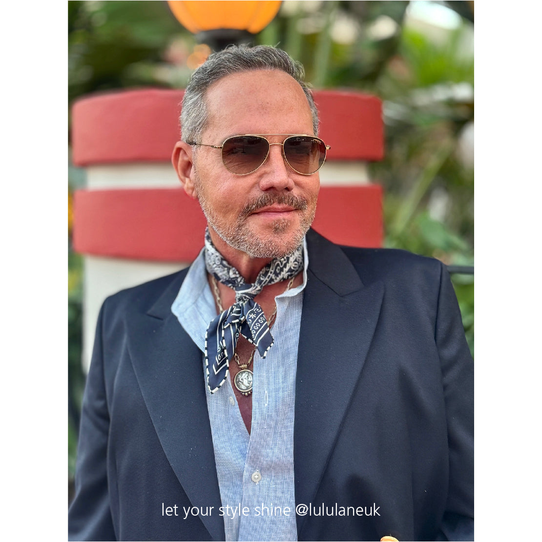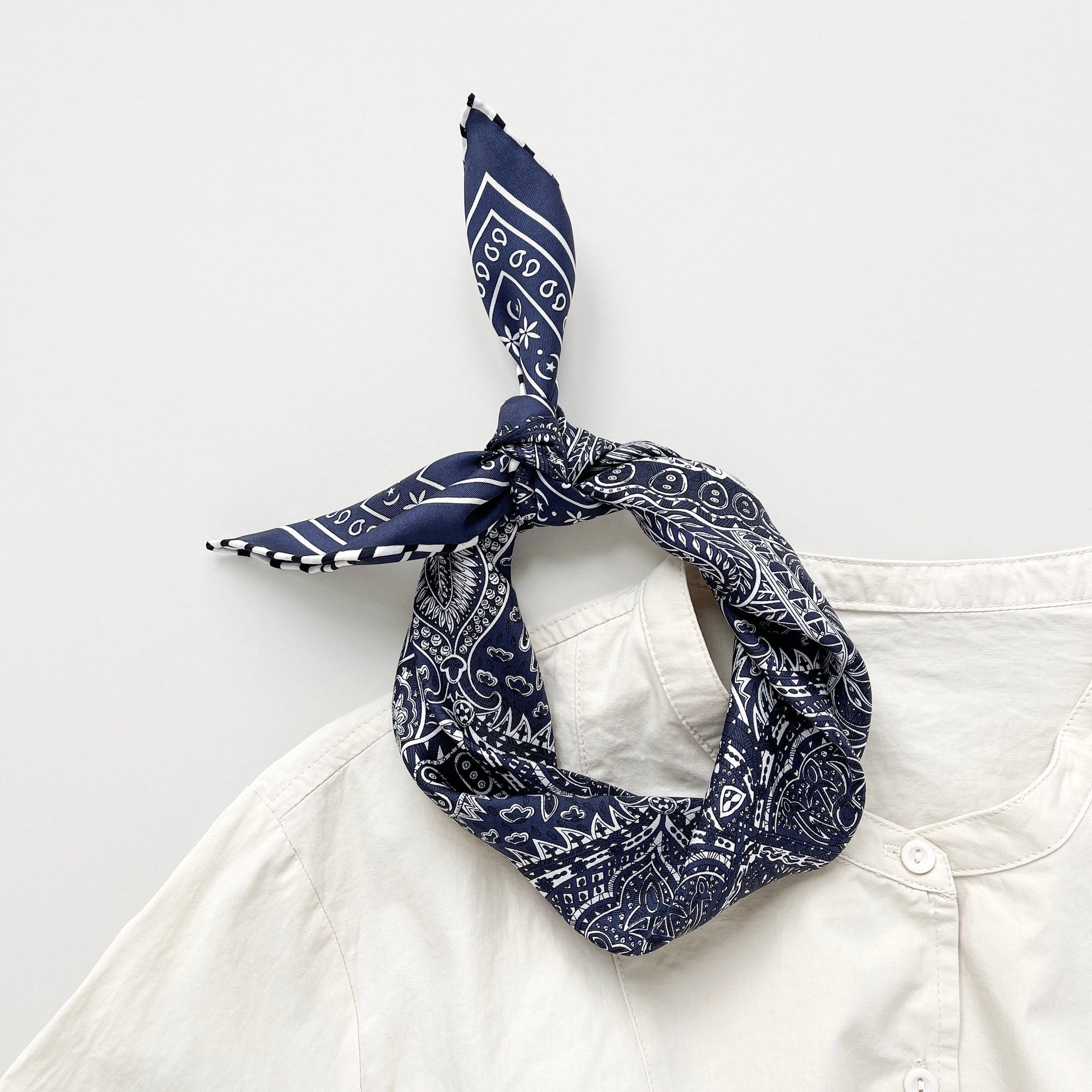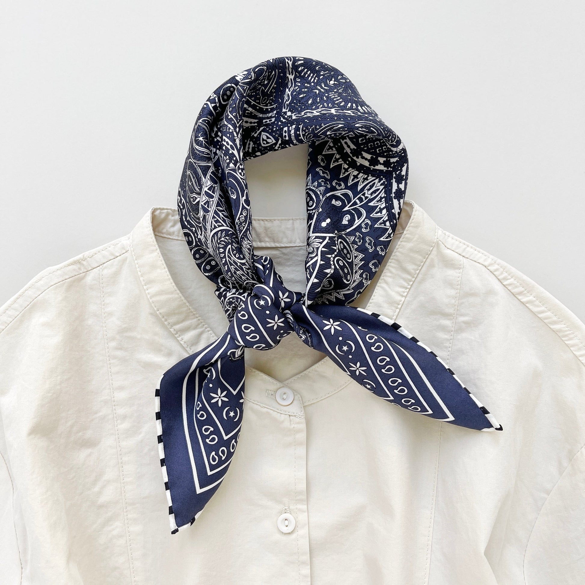 Discover our elegant small square silk scarf, available in classic navy and refreshing matcha green. Designed for both men and women, this versatile accessory can be worn as a neckerchief, bandana, or hair scarf, effortlessly elevating your style from ordinary to extraordinary. The sophisticated symmetric pattern with striped hand-rolled edges adds a refined touch to any outfit.