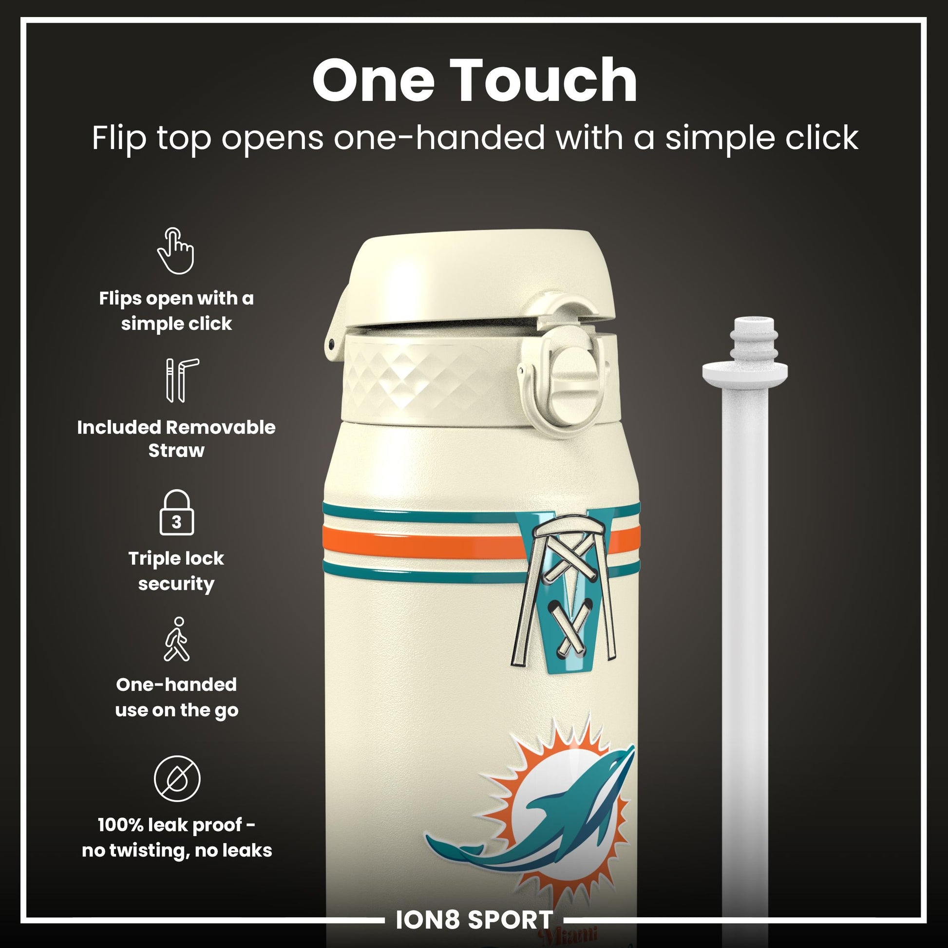 NFL x ION8 Insulated Steel Water Bottle, NFL Dolphins, 750ml (24oz)