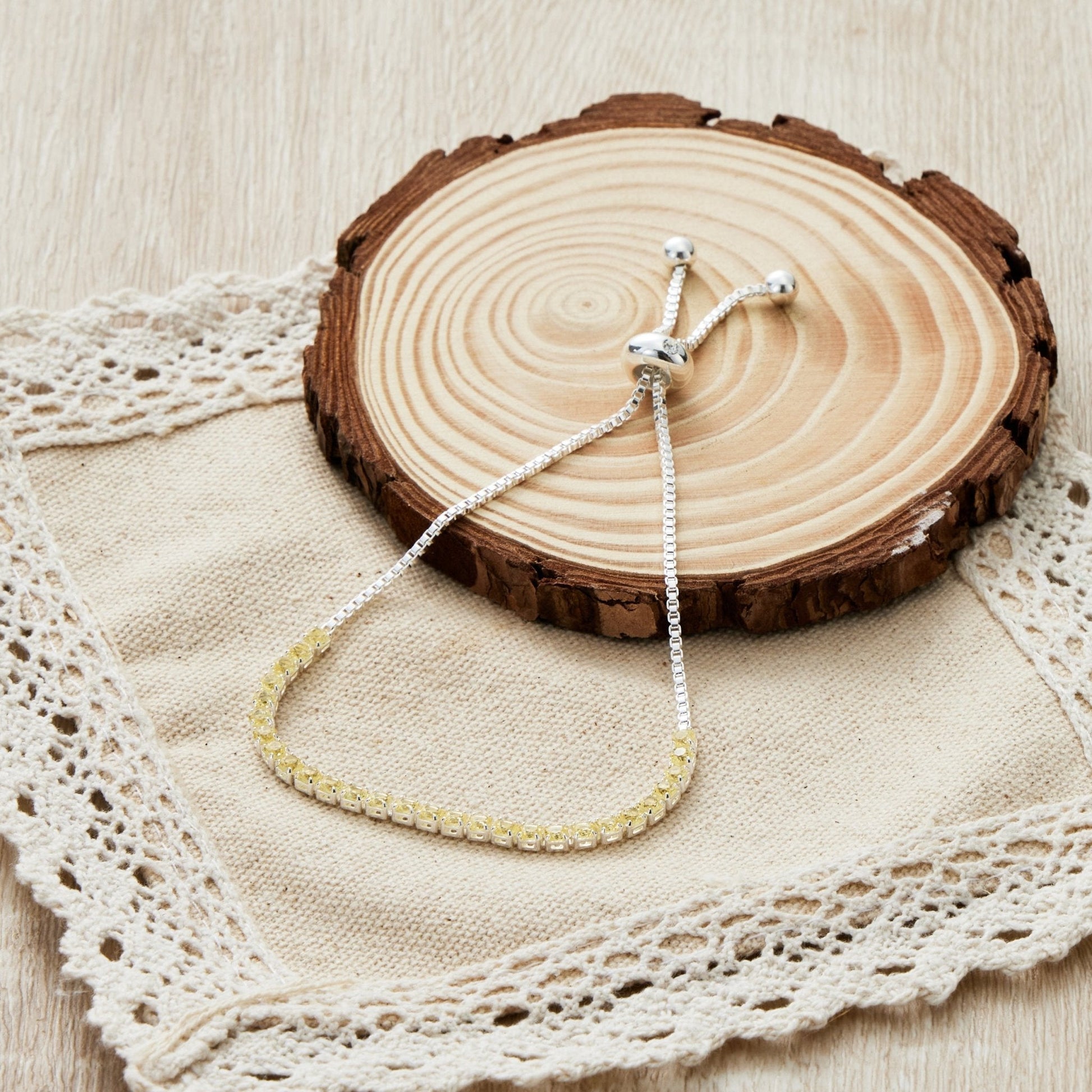 This bracelet features magnificent Zircondia® Crystals plated in silver and designed to fit comfortably with its hypoallergenic base metal and adjustable length. The sparkling yellow crystals, 3mm in size, are arranged in a stunning round shape and weigh a total of 6.02g. Packaged in a charming gift pouch with a quote card, this bracelet is the perfect way to show off your November birthstone and celebrate the beauty of friendship.