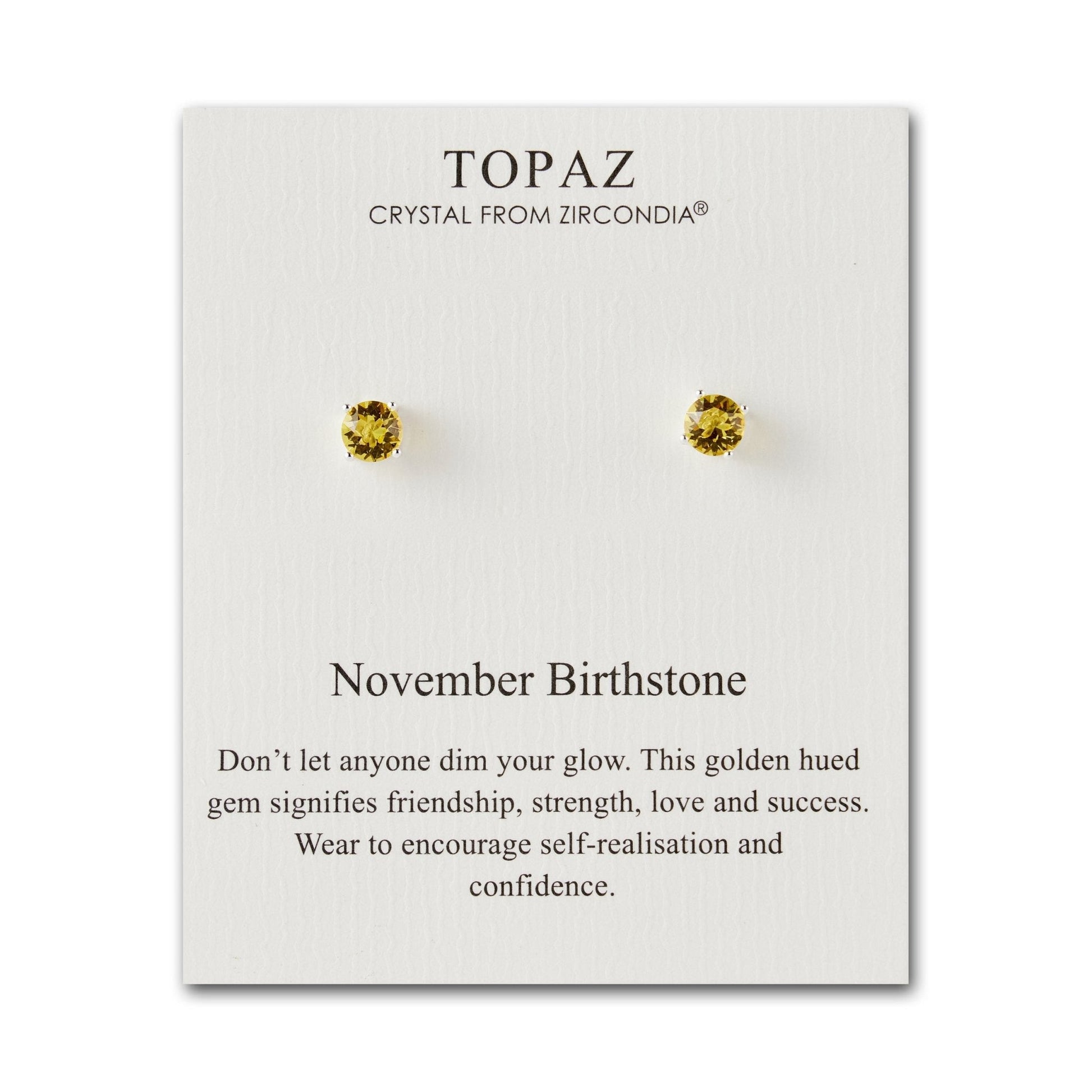 Treat yourself or someone special to these beautiful November birthstone earrings from Philip Jones. Crafted with silver plated brass alloy and featuring sparkling 6mm round Zircondia® crystals in a topaz hue, these stud earrings add a touch of glamour to any look. The butterfly closure ensures a secure fit, weighing in at only 1.2g for a comfortable wear.
