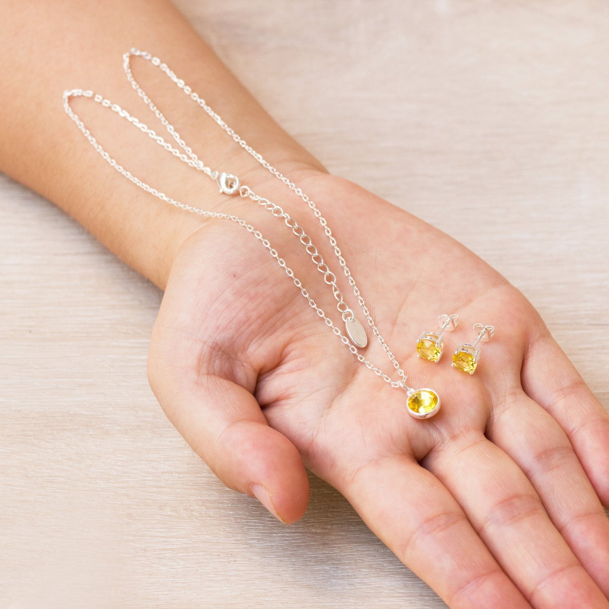 This Philip Jones November Birthstone Necklace & Earrings Set of Silver Plated Brass Alloy is 4.7g in total weight. The Pendant necklace features a 14mm (H) x 8.5mm (W) Round Topaz Zircondia® Crystal (size 8mm, 1 pc) and a 43cm + 5cm extender Cable Chain with a Lobster Claw closure. The 1.2g Stud Earrings each have a 6mm (H) x 6mm (W) Round Topaz Zircondia® Crystal (size 6mm, 2 pcs) in a 4 Prong setting with a Butterfly closure.