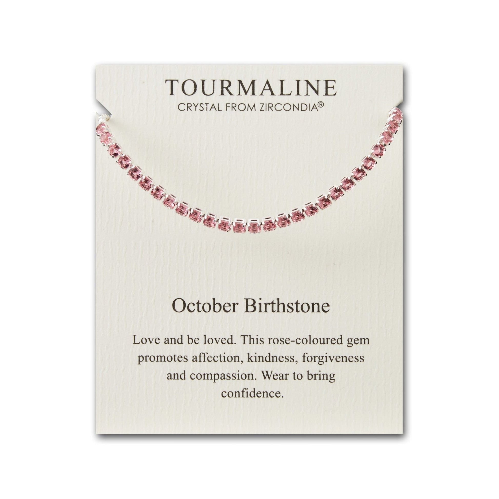 Experience the brilliance of Zircondia® crystals with this Silver Plated Friendship Bracelet. Hypoallergenic and adjustable from 12cm to 24cm, it features 28 stunning pink round crystals measuring 3mm each. Complete with a slider closure and presented in a gift pouch with a motivational quote card, this bracelet is sure to make a lasting impression. Perfect gift for an October Birthday!