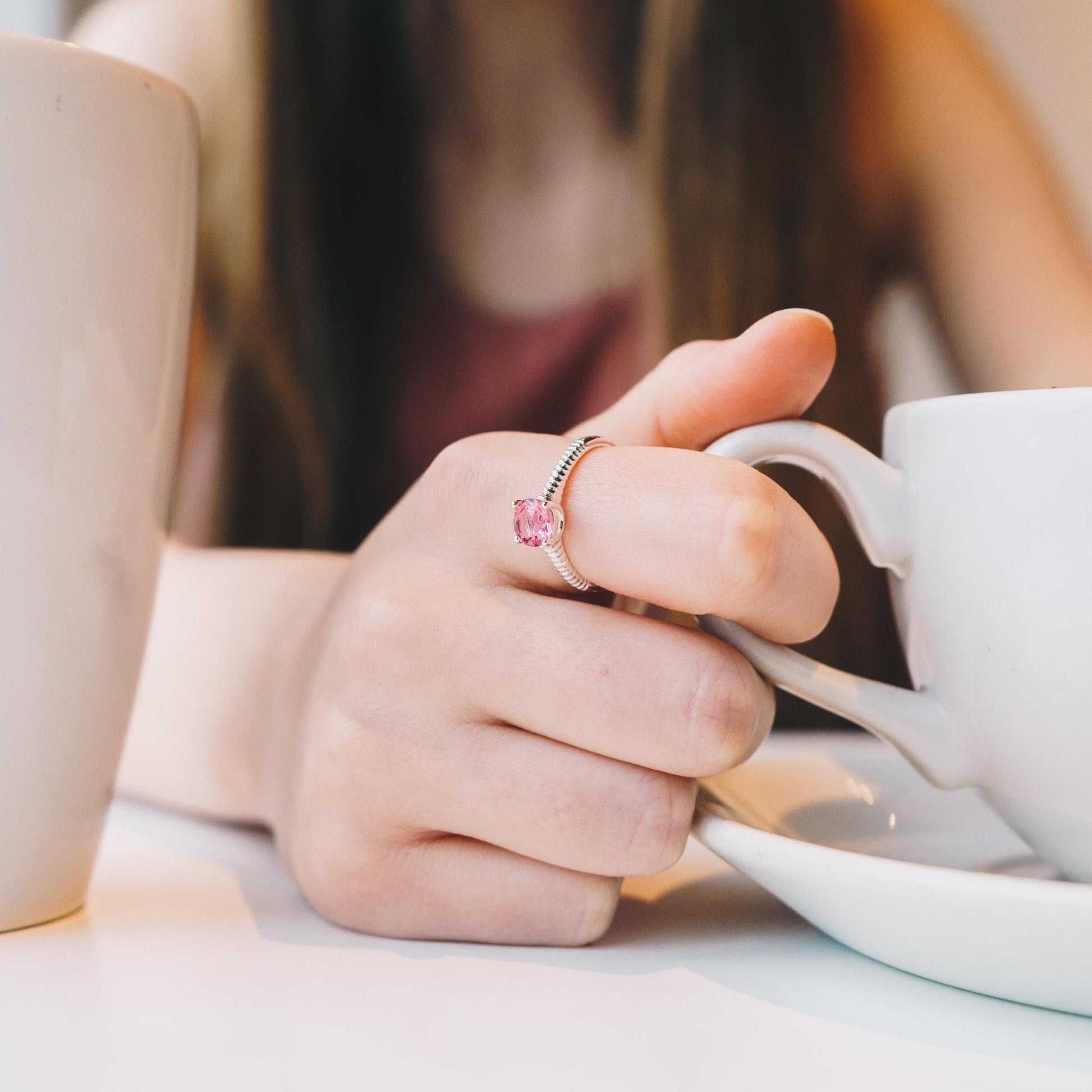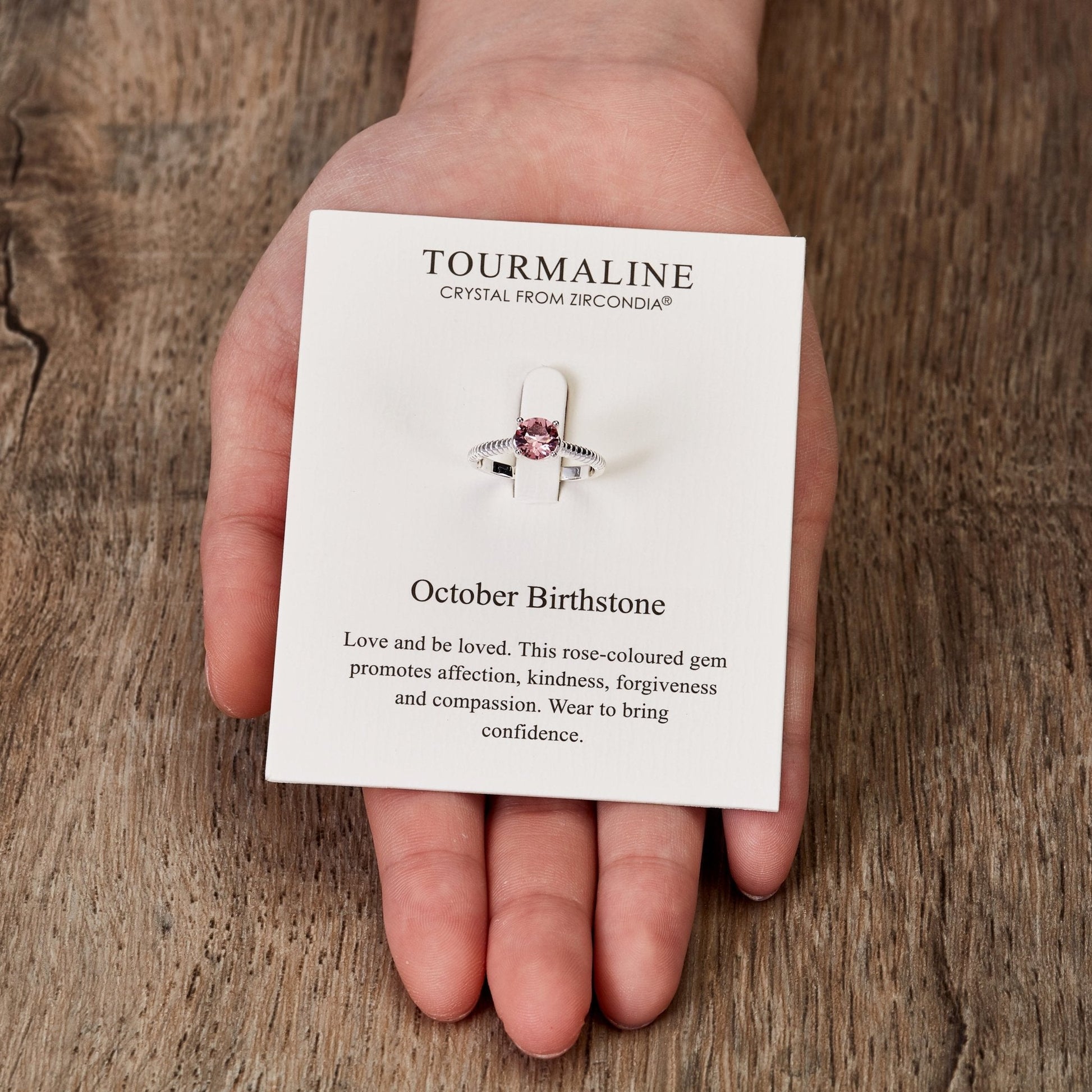 This October Birthstone Ring is the perfect accessory to complete any look. Decked with Hypoallergenic Zircondia® Crystals, beautifully shaped and Pink in colour, the ring is Silver Plated Brass Alloy and adjustable from 16.8mm to 18.4mm. Presented in a stunning Gift Pouch with Quote Card, this ring is sure to bring joy!