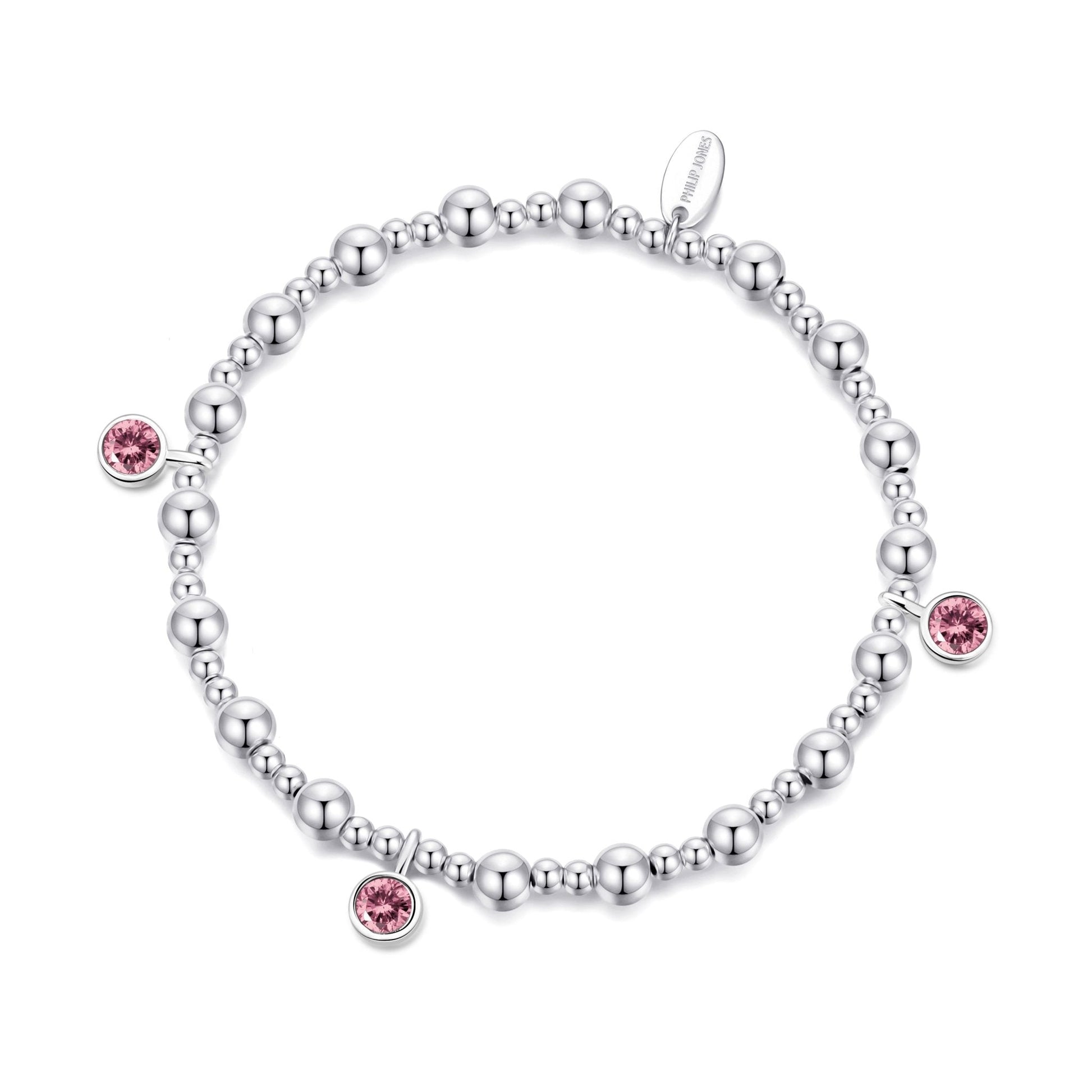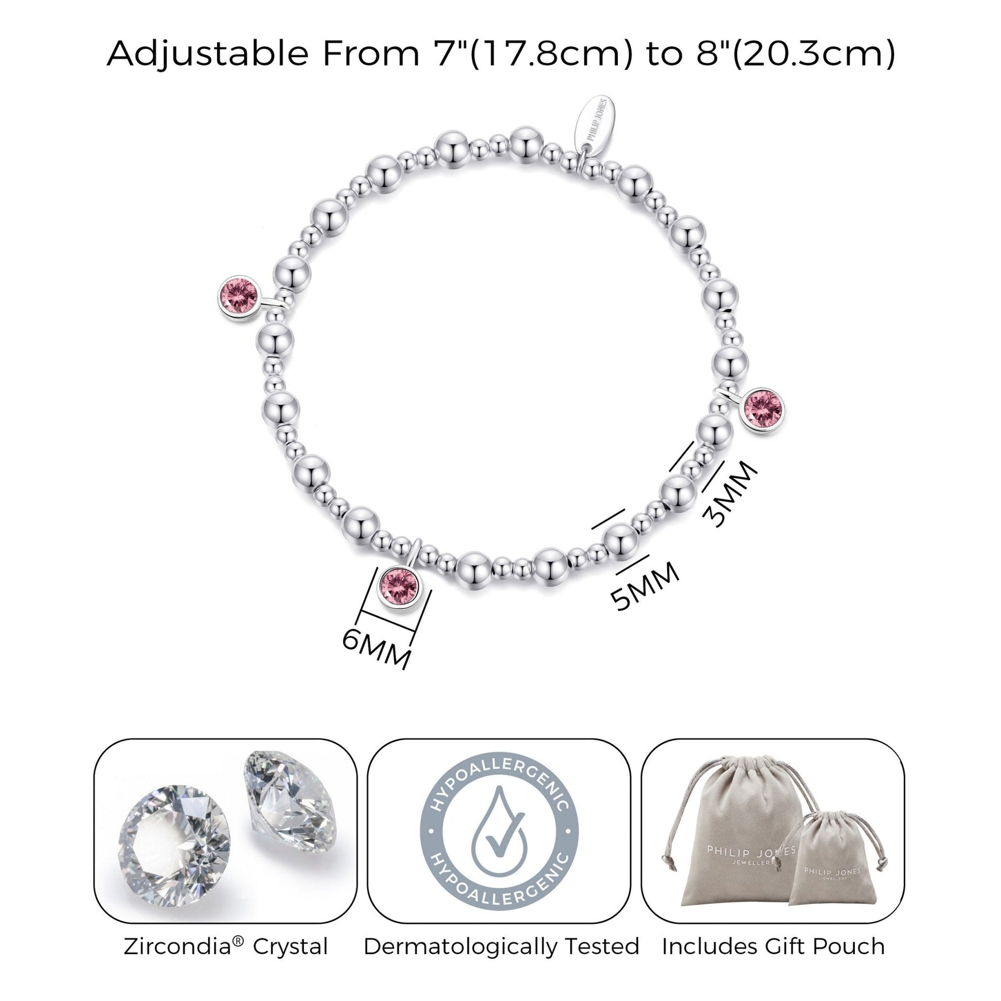 Surprise someone special with this October birthstone stretch charm bracelet crafted with hypoallergenic silver plated brass alloy, and 3 round pink Zircondia® crystals. Enjoy the maximum comfort and shine from the stretch bracelet, presented in a luxurious quote gift box.