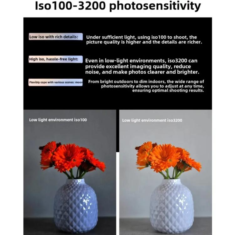 7. ISO 100-3200 sensitivity: Covering the commonly used sensitivity range of ISO 100-3200, the wide sensitivity range allows you to take colorful and detailed photos under various lighting conditions.