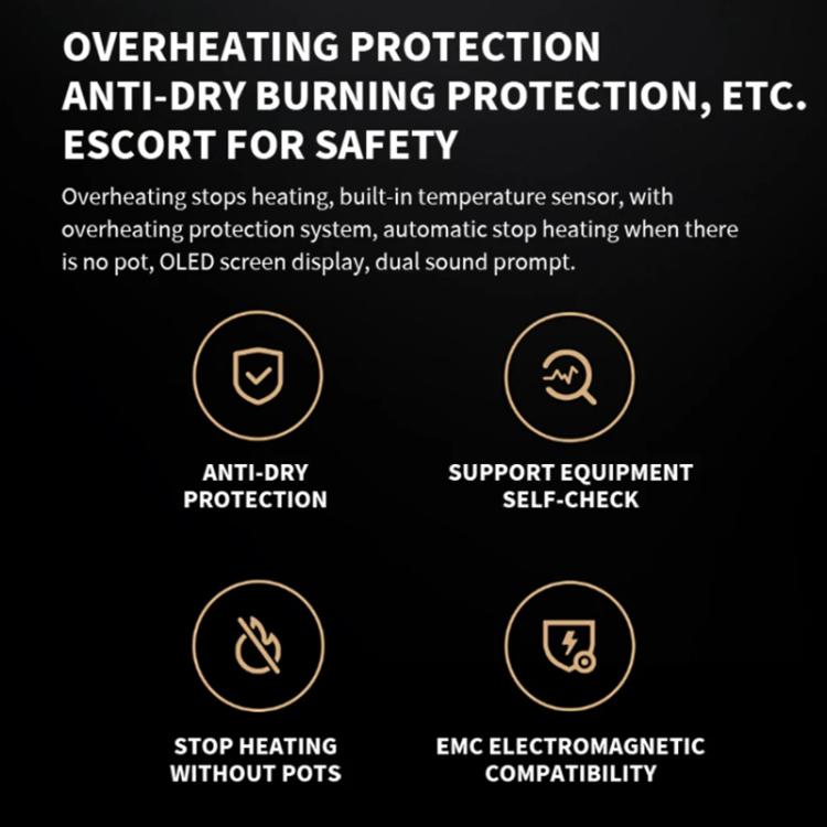 5. Support multiple safety protection, overheating stop heating, built-in temperature sensor, automatic stop heating when there is no pot, screen display and sound dual prompts.