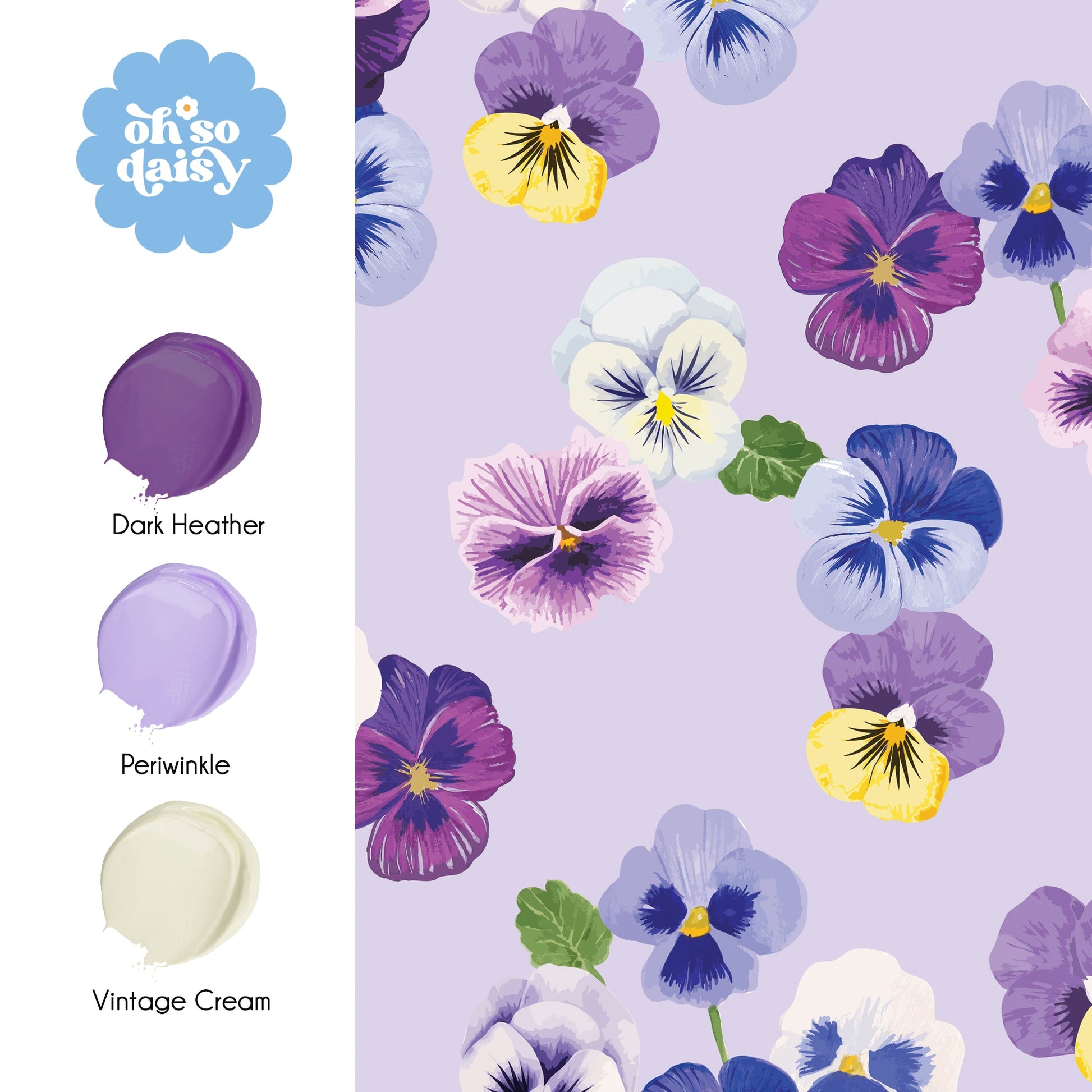 A pretty posy of Pansies dancing in the sunlight! A playful print of our hand painted Pansy and Viola flowers will add a touch of whimsy to your interiors. Rich shades of lilacs and violets will burst colour into any room and with it's spacious repeat pattern it will pair so well with our stripes and ginghams in complimenting shades.