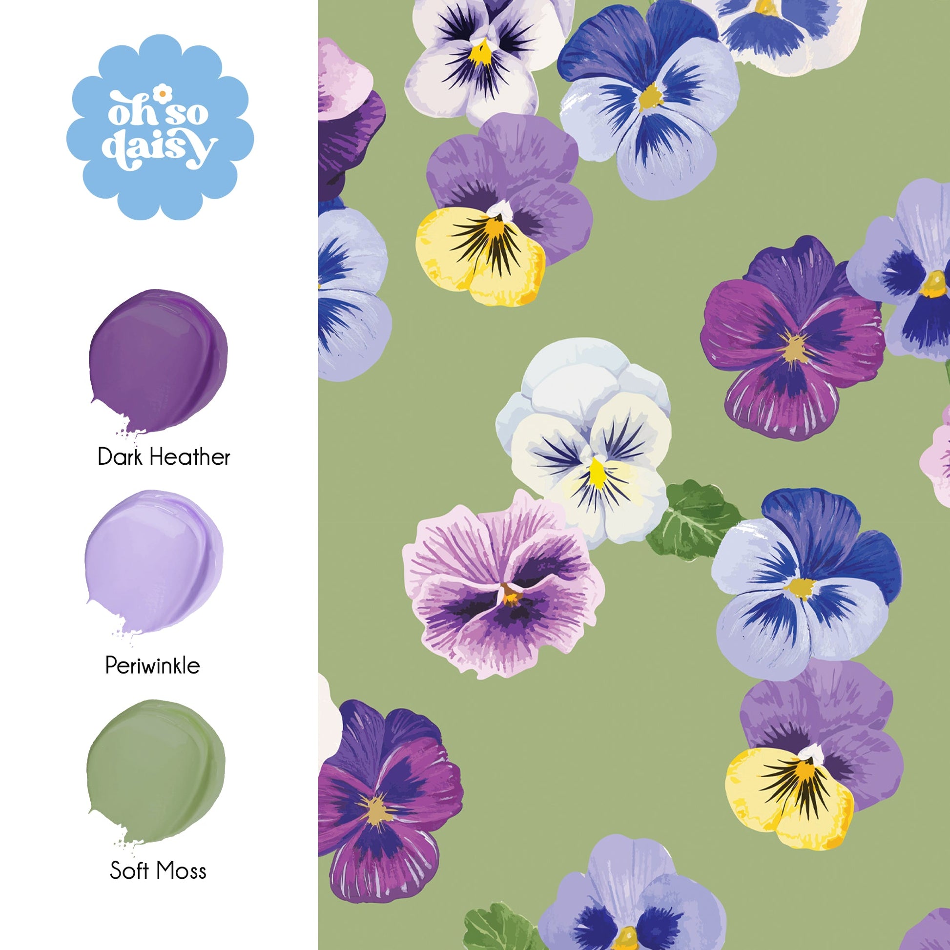 A pretty posy of Pansies dancing in the sunlight! A playful print of our hand painted Pansy and Viola flowers will add a touch of whimsy to your interiors. Rich shades of lilacs and violets will burst colour into any room and with it's spacious repeat pattern it will pair so well with our stripes and ginghams in complimenting shades.