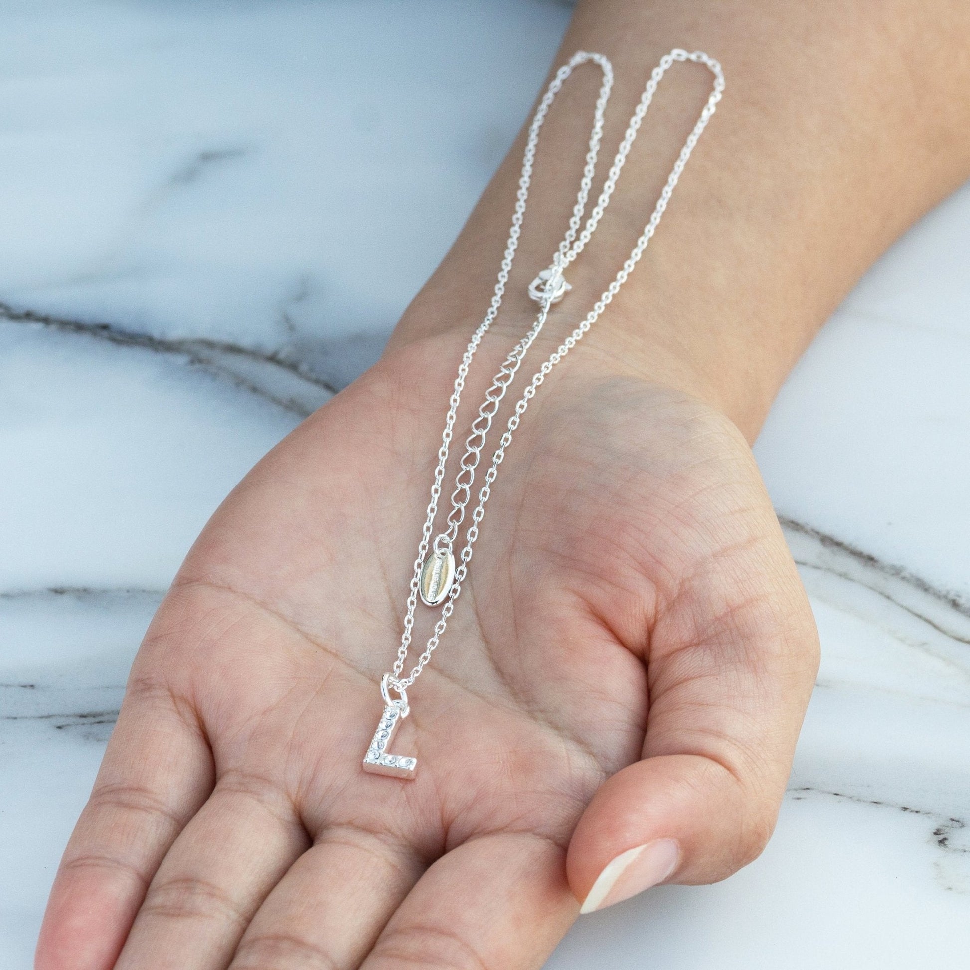 Indulge in the sparkling beauty of our Pave Initial Necklace featuring the letter L, adorned with Zirconia Crystals. Crafted with Silver Plated Brass Alloy, this hypoallergenic pendant shines bright on a 43cm chain with a 5cm extender. The lobster claw closure ensures a secure fit. Delivered in a charming gift pouch.